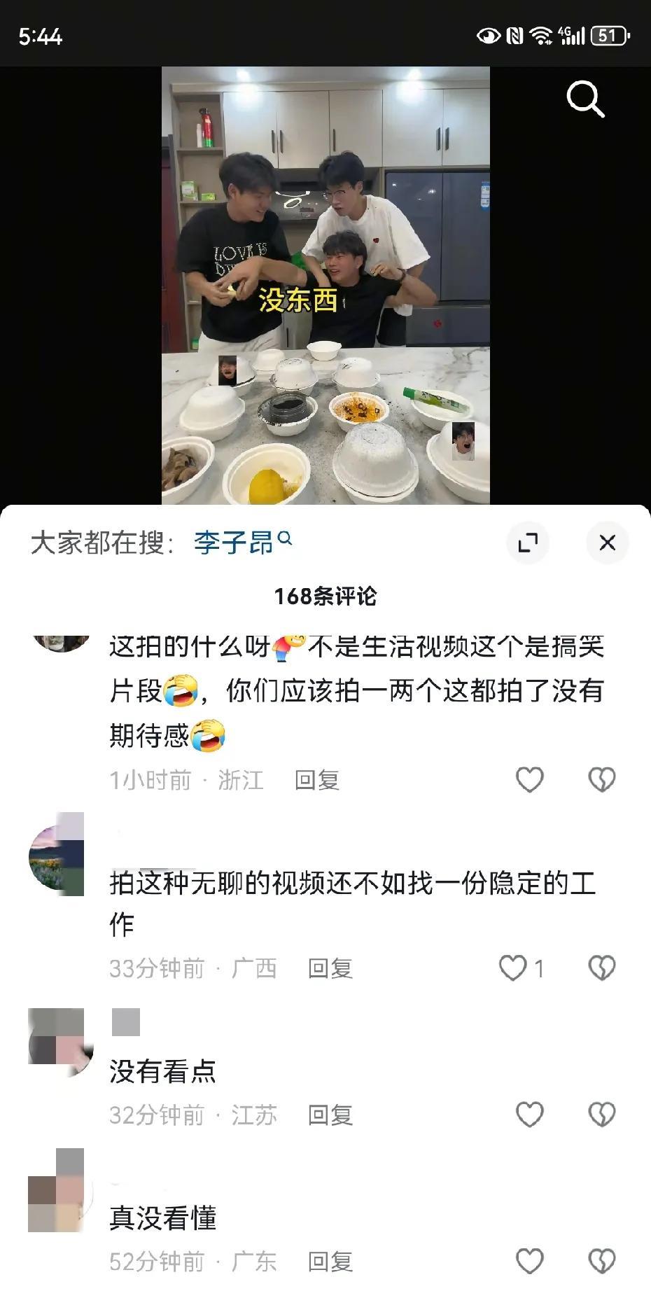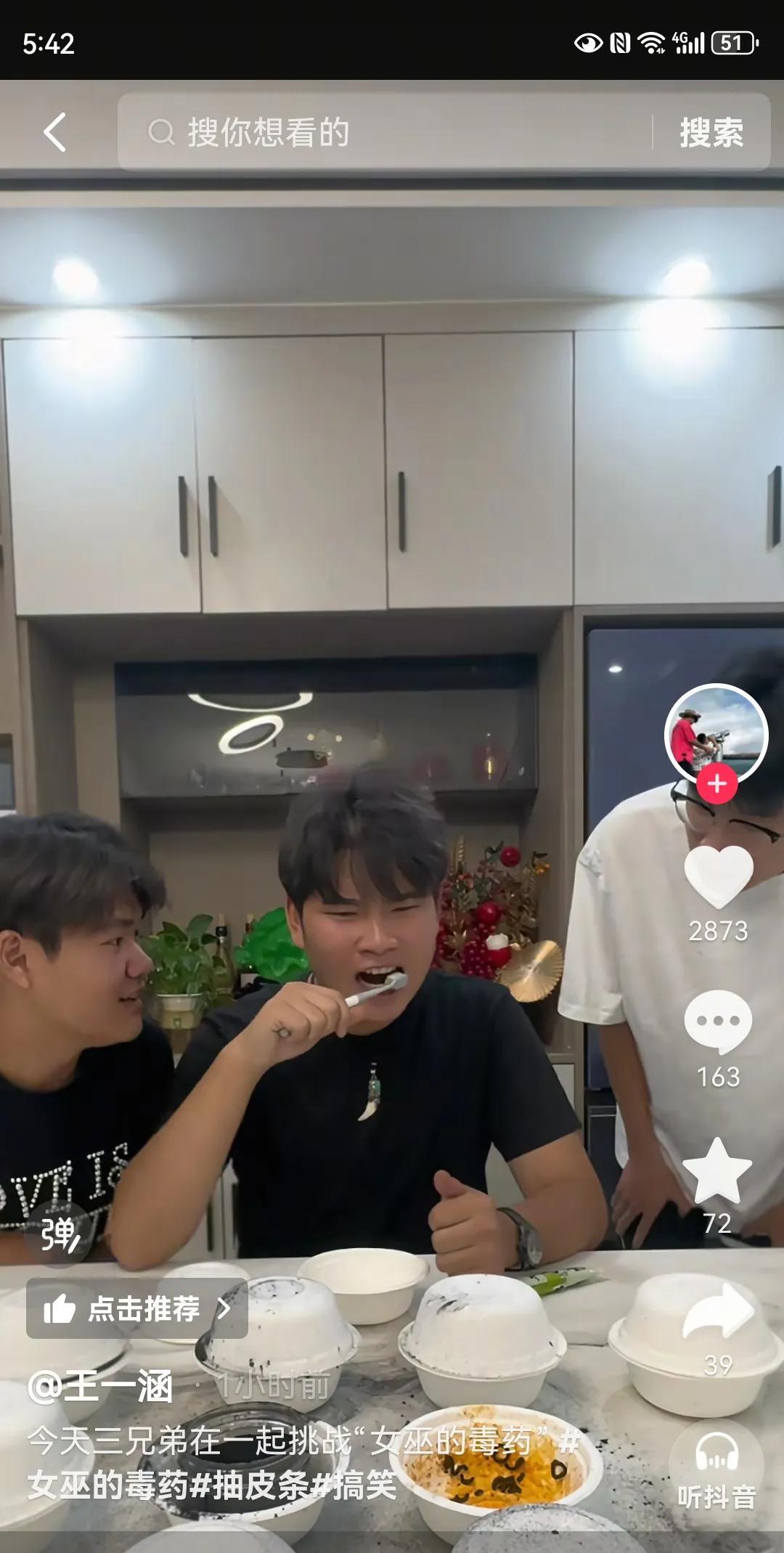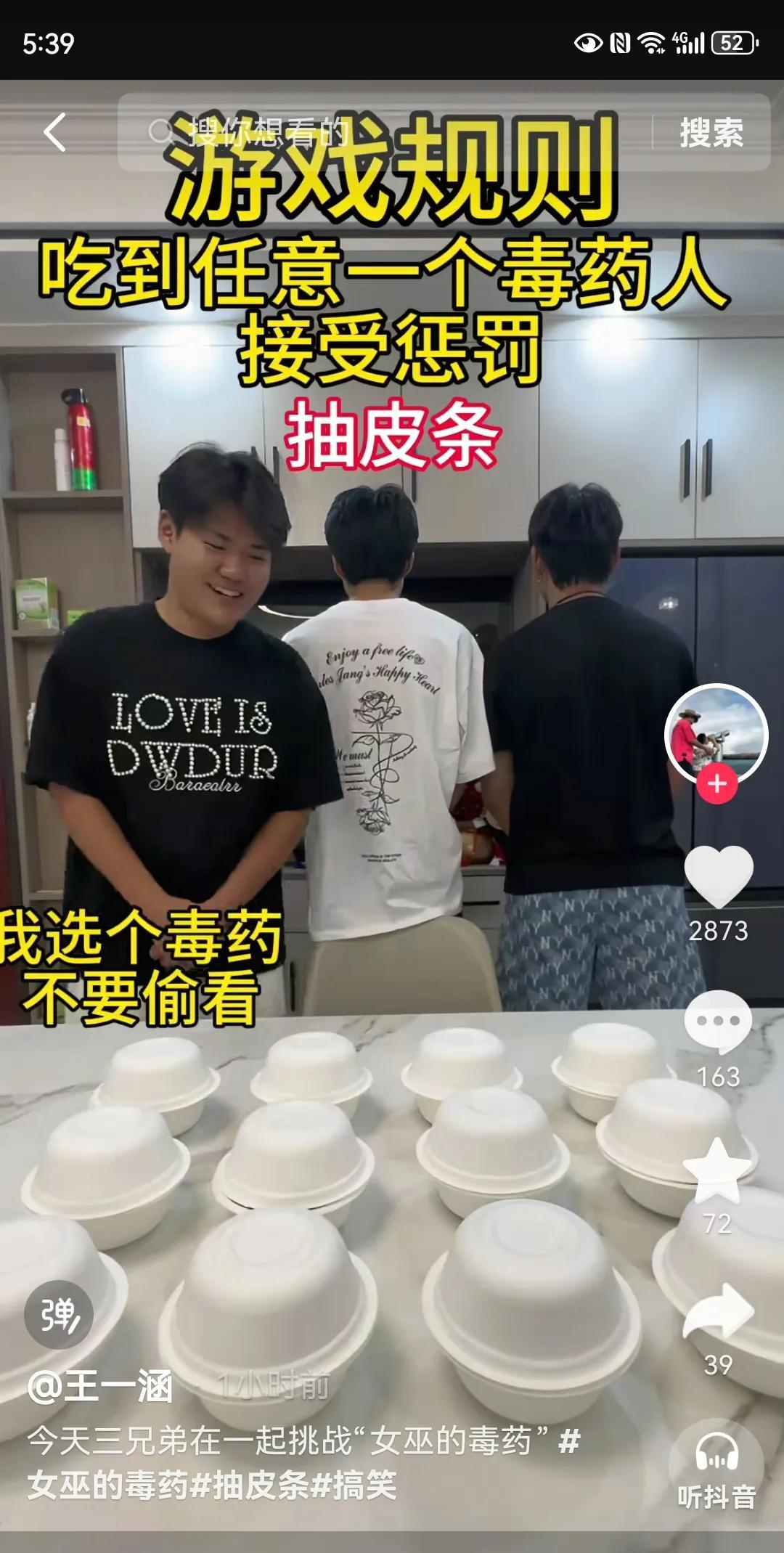 奶总家族新生代的作品出炉啦! 兄弟仨拍摄的什么“女巫的毒药”,搞笑类型的视频,三个开盲盒,挑战难吃的东西,这视频成本不高,也不需要摆弄镜头,摄像头开着轮流表演就是。看背景,应该是在谁家的新房子里面拍摄的,大概是奶总那套房子或者大双新买的那套,亦或是奶茶弟王集街上那套,反正不是娘家那老房子。 对于他们的作品,评论区有两种声音,一些人表示好看,有创意,从头笑到尾(不排除是给他们信心,故意夸赞的)。也有网友表示无聊,没意思,没看点,没看懂。