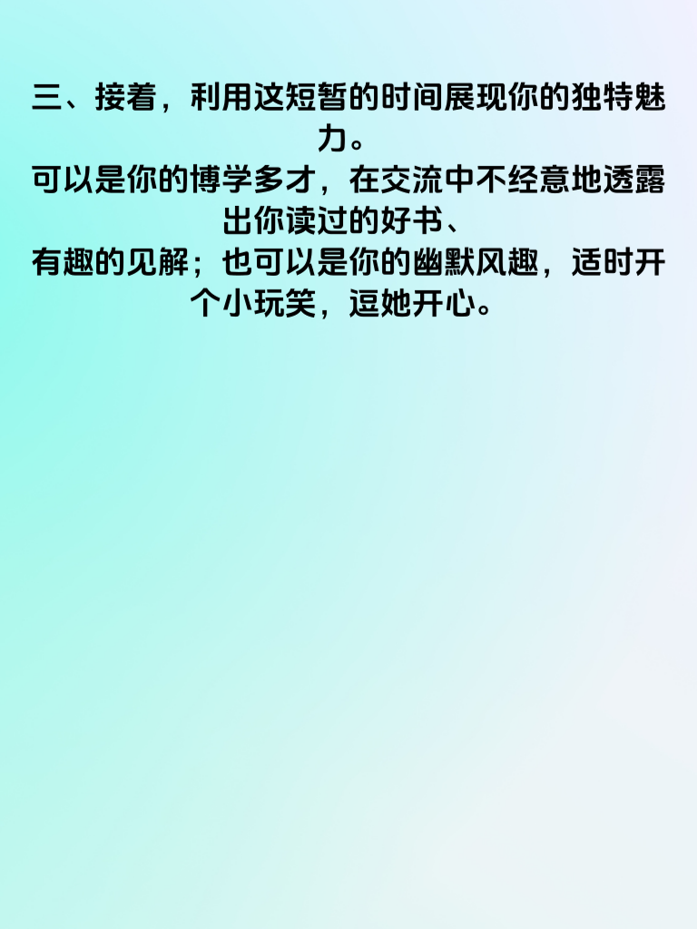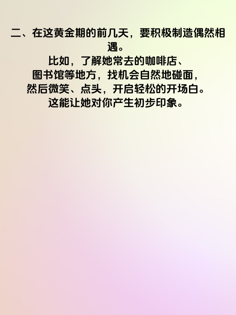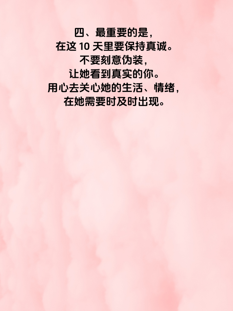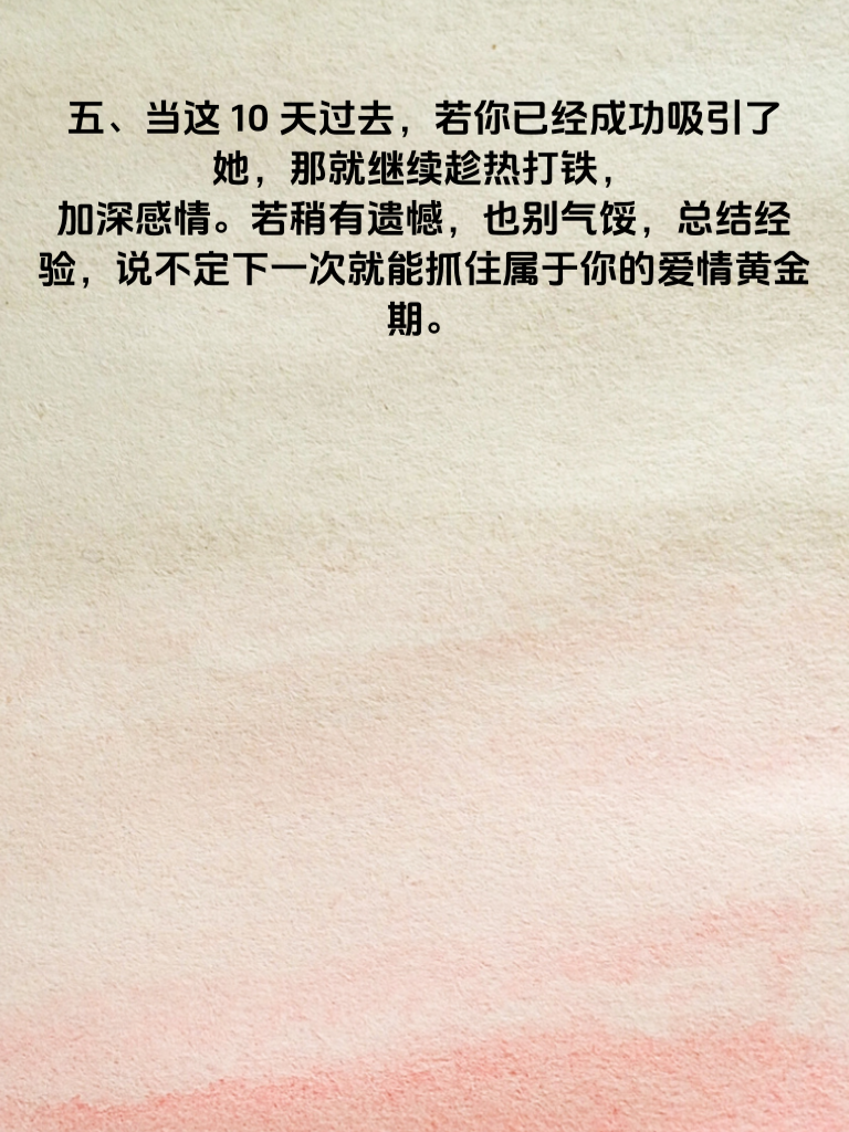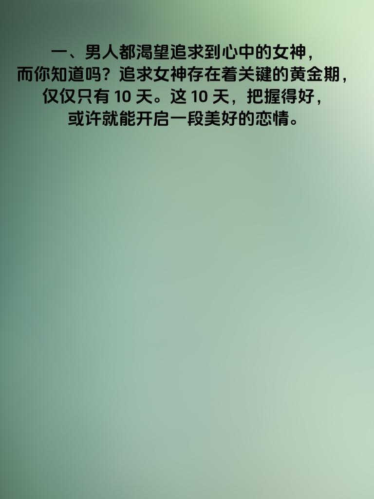 一、男人都渴望追求到心中的女神,而你知道吗?追求女神存在着关键的黄金期,仅仅只有10天。这10天,把握得好,或许就能开启一段美好的恋情。 二、在这黄金期的前几天,要积极制造偶然相遇。比如,了解她常去的咖啡店、图书馆等地方,找机会自然地碰面,然后微笑、点头,开启轻松的开场白。这能让她对你产生初步印象。 三、接着,利用这短暂的时间展现你的独特魅力。可以是你的博学多才,在交流中不经意地透露出你读过的好书、有趣的见解;也可以是你的幽默风趣,适时开个小玩笑,逗她开心。 四、最重要的是,在这10天里要保持真诚。不要刻意伪装,让她看到真实的你。用心去关心她的生活、情绪,在她需要时及时出现。 五、当这10天过去,若你已经成功吸引了她,那就继续趁热打铁,加深感情。若稍有遗憾,也别气馁,总结经验,说不定下一次就能抓住属于你的爱情黄金期。