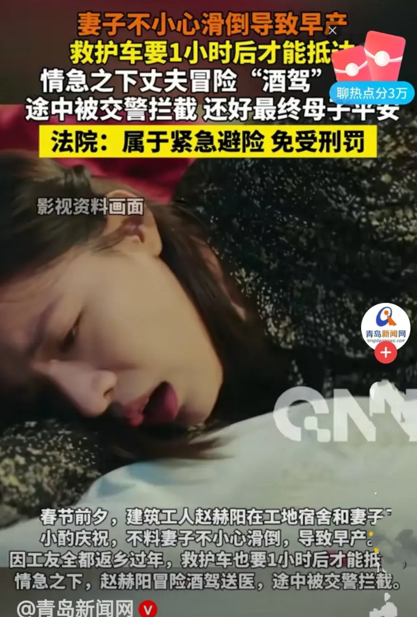 江苏,男子与妻子在建筑工地宿舍,收拾好行囊准备返乡过年,心情极好,便饮了几杯酒。谁知,孕晚期妻子不小心滑倒致早产。男子吓坏了,赶紧叫救护车,可因地处偏远,救护车要1个小时后才抵达,男子急得转圈圈,工友们都返乡走了,求助无门,他顾不得那么多,开车送妻子去医院。中途被交警拦截。警方了解情况后,紧急协调救护车接力救援,最终母子平安,而后男子因醉驾被起诉。结果出人意料!