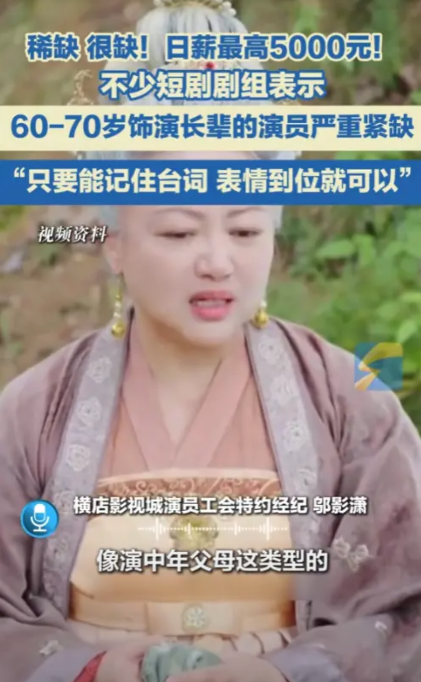 只要说几句台词,有着符合剧情的表情,要是气质好的,能背大段台词,演霸道总裁的父亲,一天拿5000块都不稀奇,这么缺人,主要是这个年纪的老人,要么觉得“拍戏是年轻人的事”,要么怕记不住词出洋相。