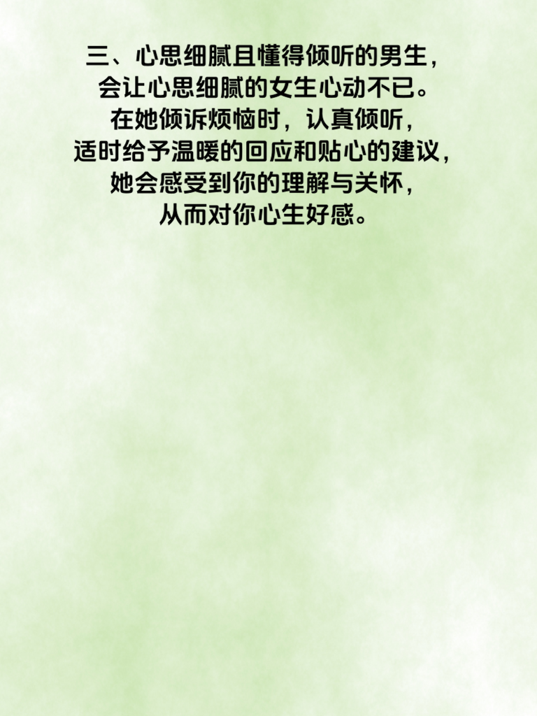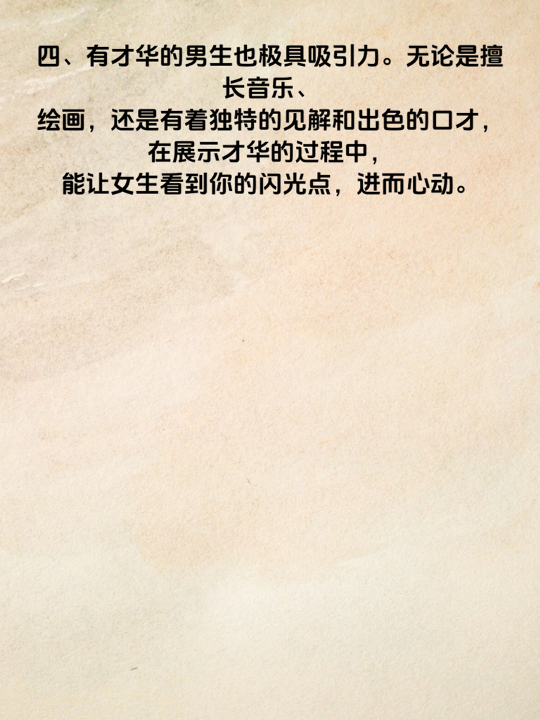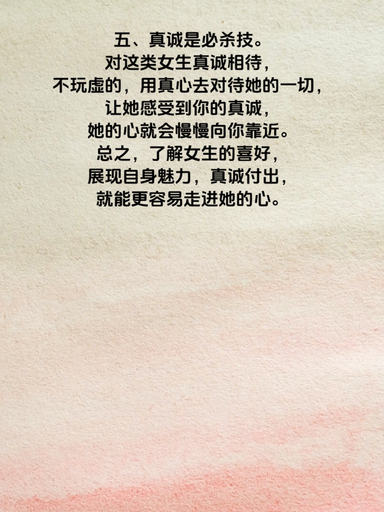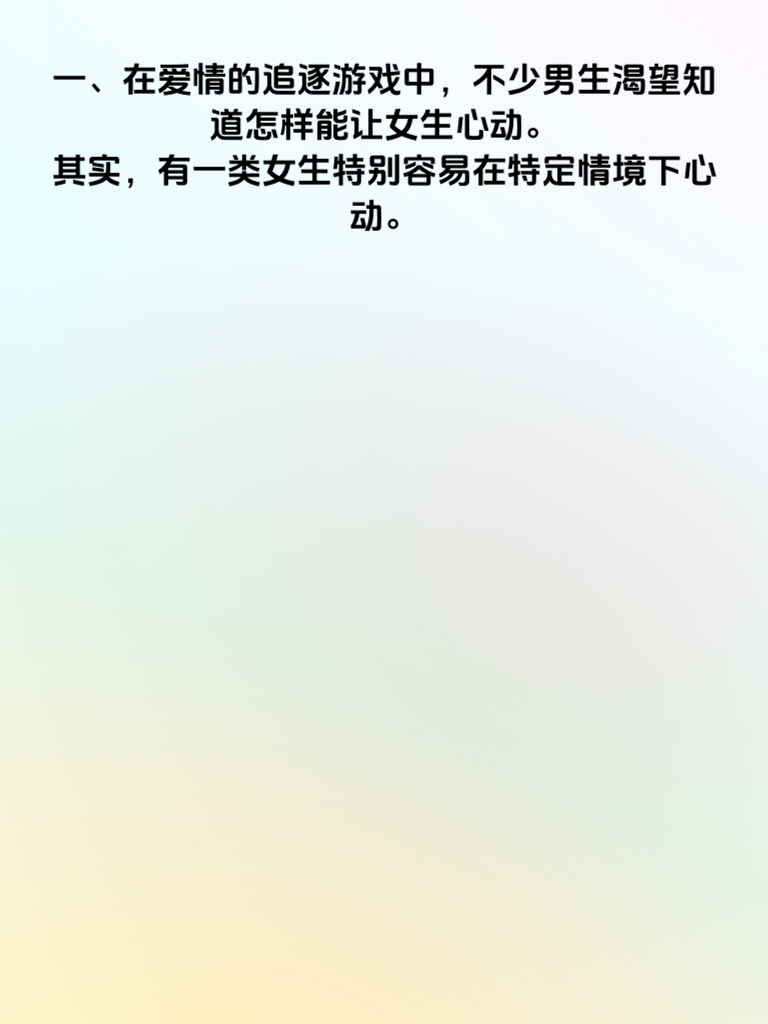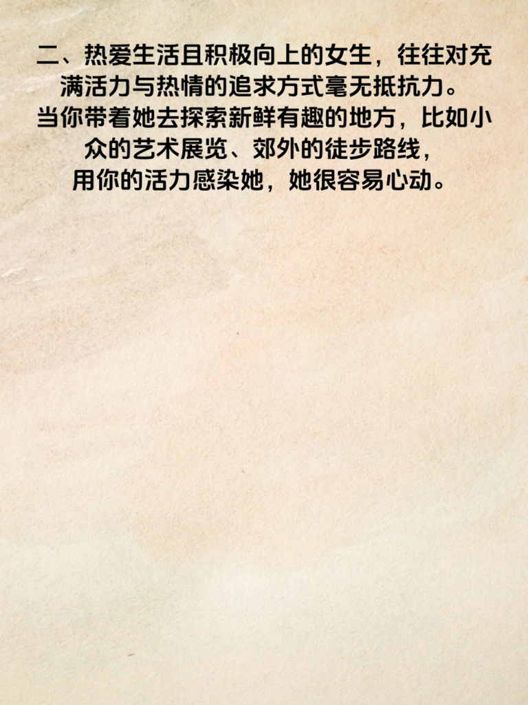 一、在爱情的追逐游戏中,不少男生渴望知道怎样能让女生心动。其实,有一类女生特别容易在特定情境下心动。 二、热爱生活且积极向上的女生,往往对充满活力与热情的追求方式毫无抵抗力。当你带着她去探索新鲜有趣的地方,比如小众的艺术展览、郊外的徒步路线,用你的活力感染她,她很容易心动。 三、心思细腻且懂得倾听的男生,会让心思细腻的女生心动不已。在她倾诉烦恼时,认真倾听,适时给予温暖的回应和贴心的建议,她会感受到你的理解与关怀,从而对你心生好感。 四、有才华的男生也极具吸引力。无论是擅长音乐、绘画,还是有着独特的见解和出色的口才,在展示才华的过程中,能让女生看到你的闪光点,进而心动。 五、真诚是必杀技。对这类女生真诚相待,不玩虚的,用真心去对待她的一切,让她感受到你的真诚,她的心就会慢慢向你靠近。总之,了解女生的喜好,展现自身魅力,真诚付出,就能更容易走进她的心。