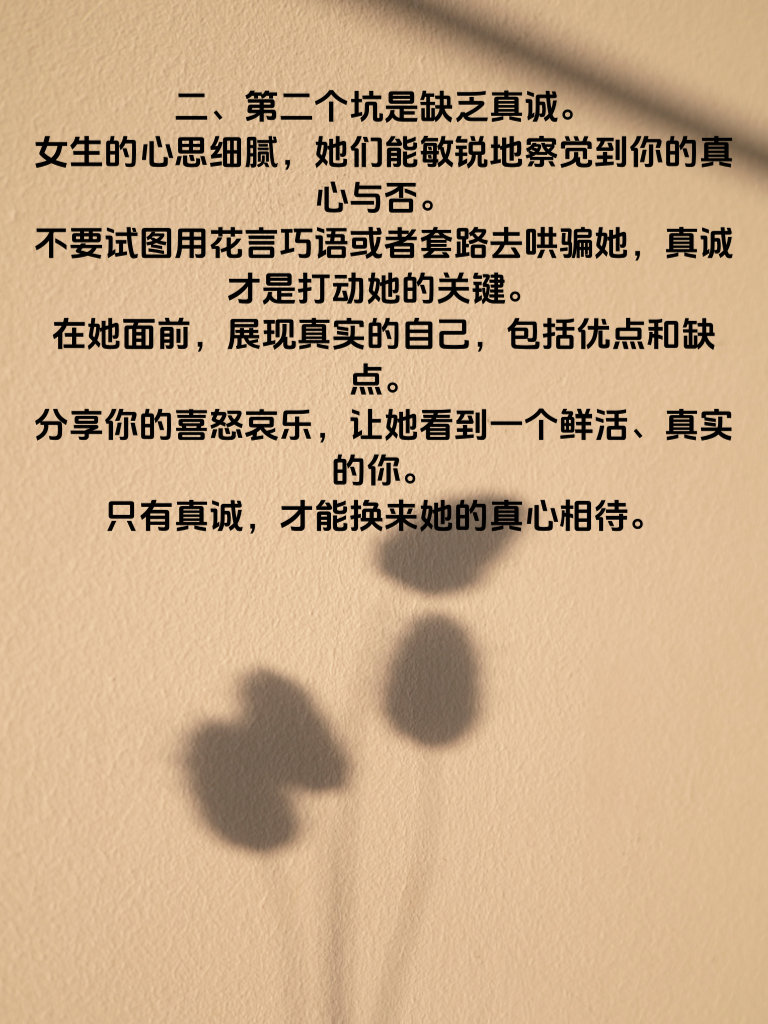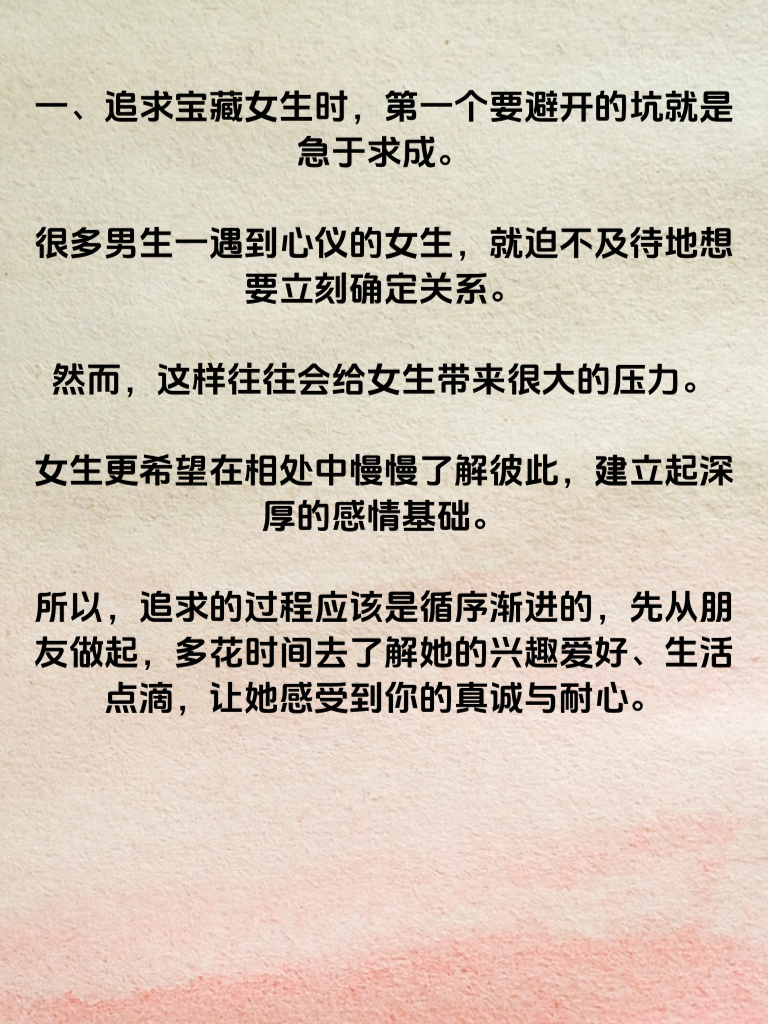 一、追求宝藏女生时,第一个要避开的坑就是急于求成。很多男生一遇到心仪的女生,就迫不及待地想要立刻确定关系。然而,这样往往会给女生带来很大的压力。女生更希望在相处中慢慢了解彼此,建立起深厚的感情基础。所以,追求的过程应该是循序渐进的,先从朋友做起,多花时间去了解她的兴趣爱好、生活点滴,让她感受到你的真诚与耐心。 二、第二个坑是缺乏真诚。女生的心思细腻,她们能敏锐地察觉到你的真心与否。不要试图用花言巧语或者套路去哄骗她,真诚才是打动她的关键。在她面前,展现真实的自己,包括优点和缺点。分享你的喜怒哀乐,让她看到一个鲜活、真实的你。只有真诚,才能换来她的真心相待。 三、最后一个坑是忽略她的感受。追求过程中,不能只考虑自己的想法和需求,要时刻关注她的感受。比如,安排约会时要考虑她的时间和喜好;聊天时要认真倾听她的想法,给予她足够的尊重和回应。当她遇到困难或者不开心时,及时给予关心和支持。只有让她感受到你对她的在乎,她才会更愿意靠近你。