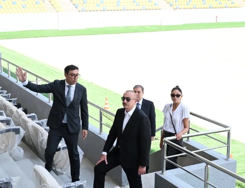 既是工作,也是生活。阿塞拜疆总统阿利耶夫携夫人阿利耶娃视察巴库体育场建设情况,阿利耶娃的香肠嘴是越来越明显了。
