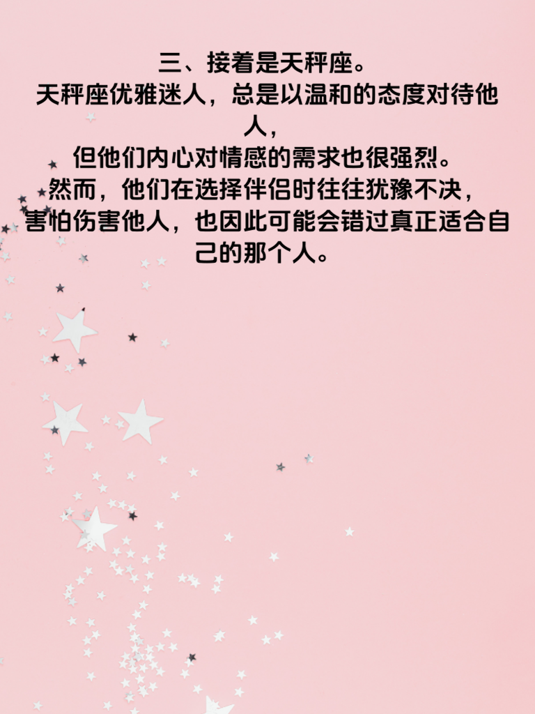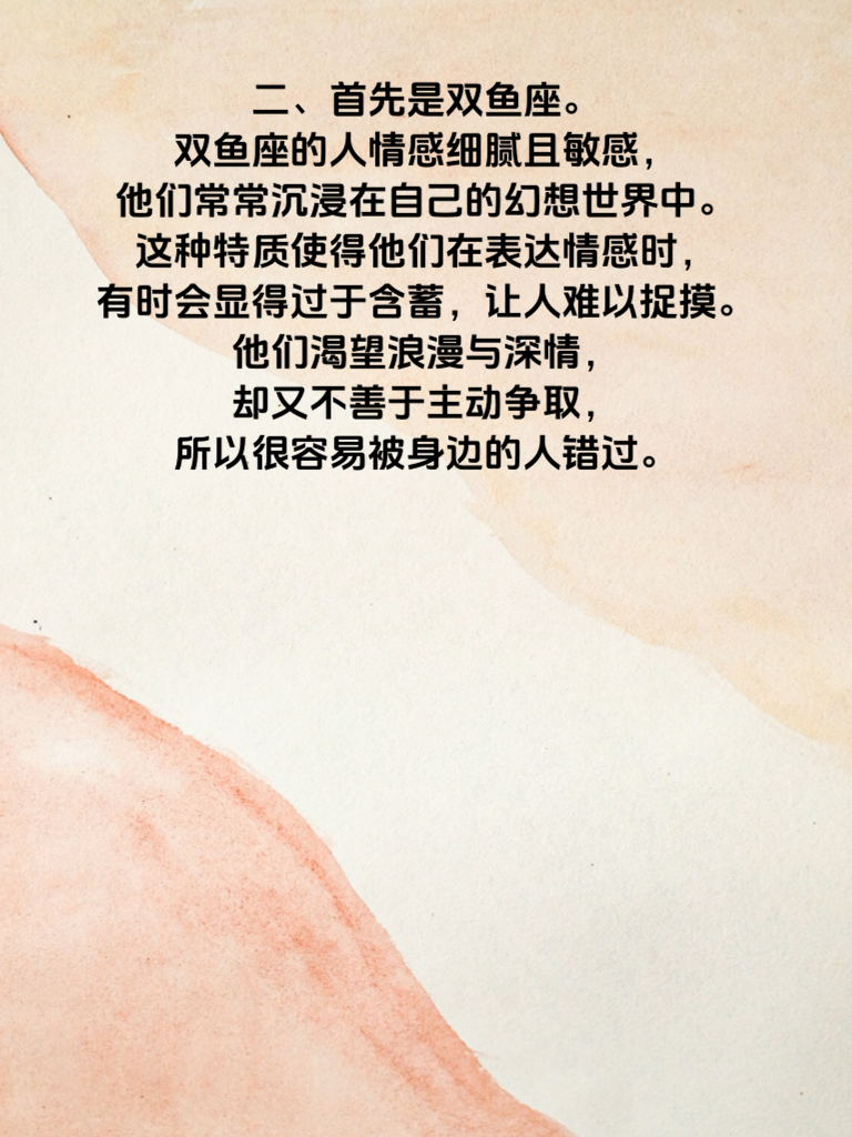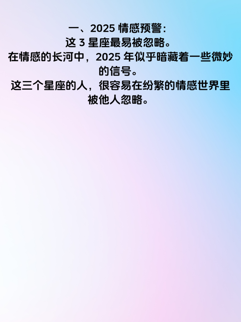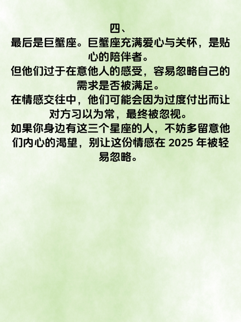 一、2025情感预警:这3星座最易被忽略。在情感的长河中,2025年似乎暗藏着一些微妙的信号。这三个星座的人,很容易在纷繁的情感世界里被他人忽略。 二、首先是双鱼座。双鱼座的人情感细腻且敏感,他们常常沉浸在自己的幻想世界中。这种特质使得他们在表达情感时,有时会显得过于含蓄,让人难以捉摸。他们渴望浪漫与深情,却又不善于主动争取,所以很容易被身边的人错过。 三、接着是天秤座。天秤座优雅迷人,总是以温和的态度对待他人,但他们内心对情感的需求也很强烈。然而,他们在选择伴侣时往往犹豫不决,害怕伤害他人,也因此可能会错过真正适合自己的那个人。 四、最后是巨蟹座。巨蟹座充满爱心与关怀,是贴心的陪伴者。但他们过于在意他人的感受,容易忽略自己的需求是否被满足。在情感交往中,他们可能会因为过度付出而让对方习以为常,最终被忽视。如果你身边有这三个星座的人,不妨多留意他们内心的渴望,别让这份情感在2025年被轻易忽略。
