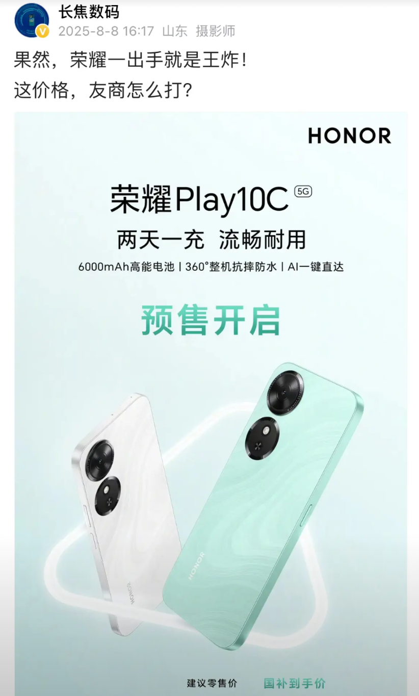国补到手551,有5G,有6000mAh电池,还有360度防水,还直接配备了AI直达键,以前这种手机要是买到手,最少要1000元左右,现在荣耀500多就拿下了,这不是良不良心的问题,这是直接打算放福利啊!