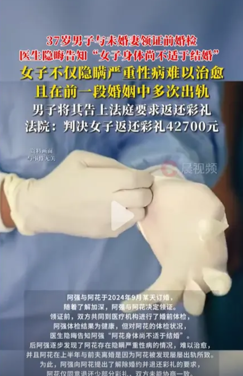 山东,一37岁男子带着女友去做婚前检查,医生隐晦告知其女友的身体不适合结婚。后来男子才了解到,女子不仅患有严重性 病,而且在前一段婚姻中,女友竟然婚内多次出轨。男子一阵后怕,果断提出分手,并要求女友返还6.8万元彩礼,却遭到了拒绝,只同意退还少部分彩礼。法院判了!