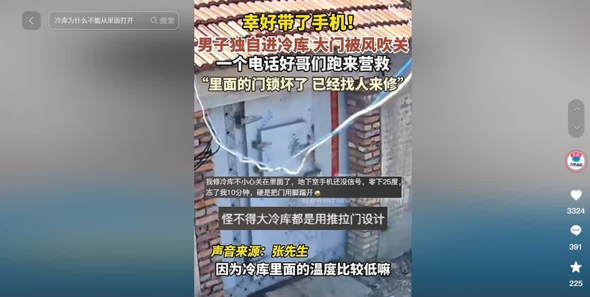河南周口,一男子独自去冷库里面拿东西,只是没想到当天的风比较大,在他进去之后大风直接将门给吹关上了,里面的门锁坏了男子一时出不来,好在他当时拿有手机,赶忙一个电话让自己的好哥们来救自己,不然自己就成了人形“冰棍”了。 3月15号那天,河南周口有个哥们儿自己去冷库拿东西。那天风特别大,谁都没想到,这事儿差点儿就闹大了。 这哥们儿刚一进冷库,大风就“呼啦”一下把门给吹上了,门锁也“咔嚓”一声锁上了,从里面根本打不开。冷库里头冷得跟冰窖似的,他被冻得直打哆嗦,动都动不了。还好他带了手机,一看自己出不去了,赶紧给朋友打了个电话求救。 没过几分钟,朋友就赶到了,一块儿使劲儿把门给撬开了,这哥们儿这才算捡回一条命。事后他还吓得直哆嗦:“就那么几分钟,我都快冻成冰棍儿了,再晚点儿可真就完蛋了。” 最后,多亏了朋友帮忙,这哥们儿才平安无事,这场大风惹出的麻烦也就这么过去了。你说这运气也太巧了,风刚好把门吹关上了,还好他带了手机。就差那么一点儿,不然后果可严重了。 你们有没有遇到过被困或者被锁的经历啊?最后都是咋解决的呢?快来评论区分享下你的故事吧。 消息来自大象新闻,2025年3月16日报道。