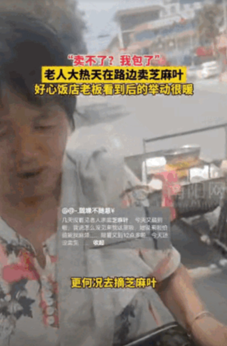 8月18日,河南南阳,一名饭店老板心酸的发现,一位老人大热天在路边卖芝麻叶,过了饭点了还没吃饭,一上午卖了不到10块钱。