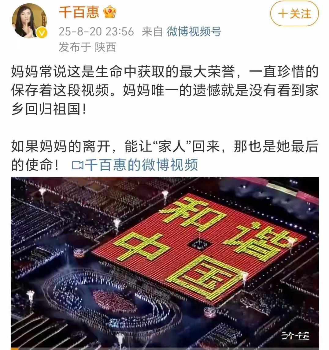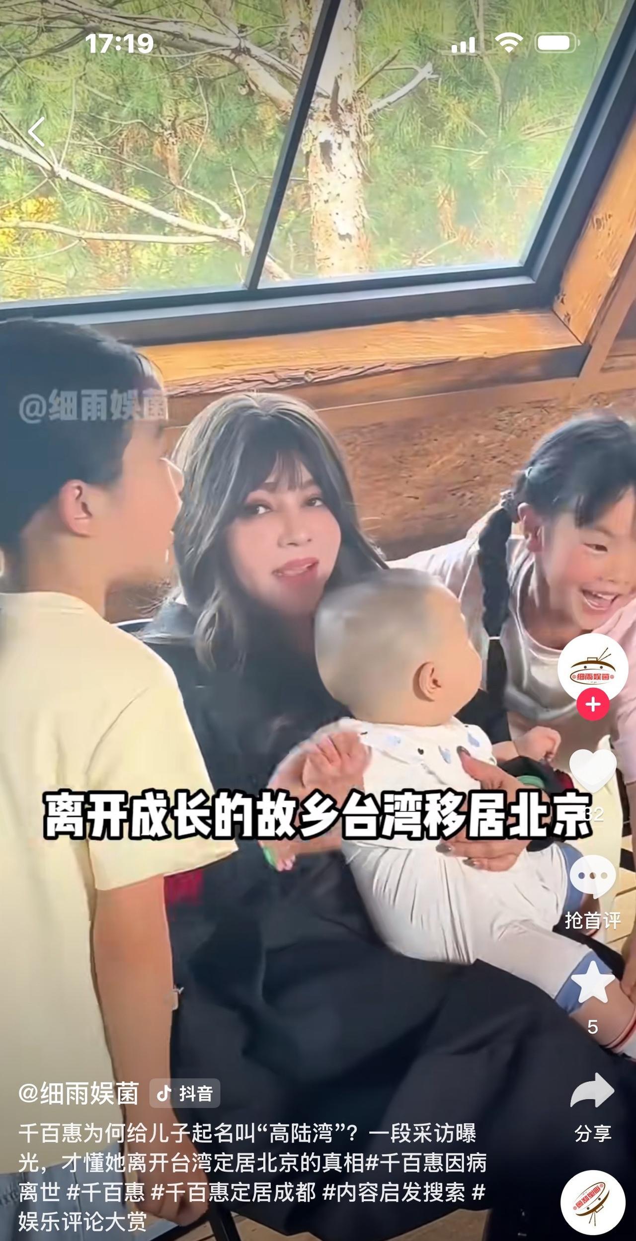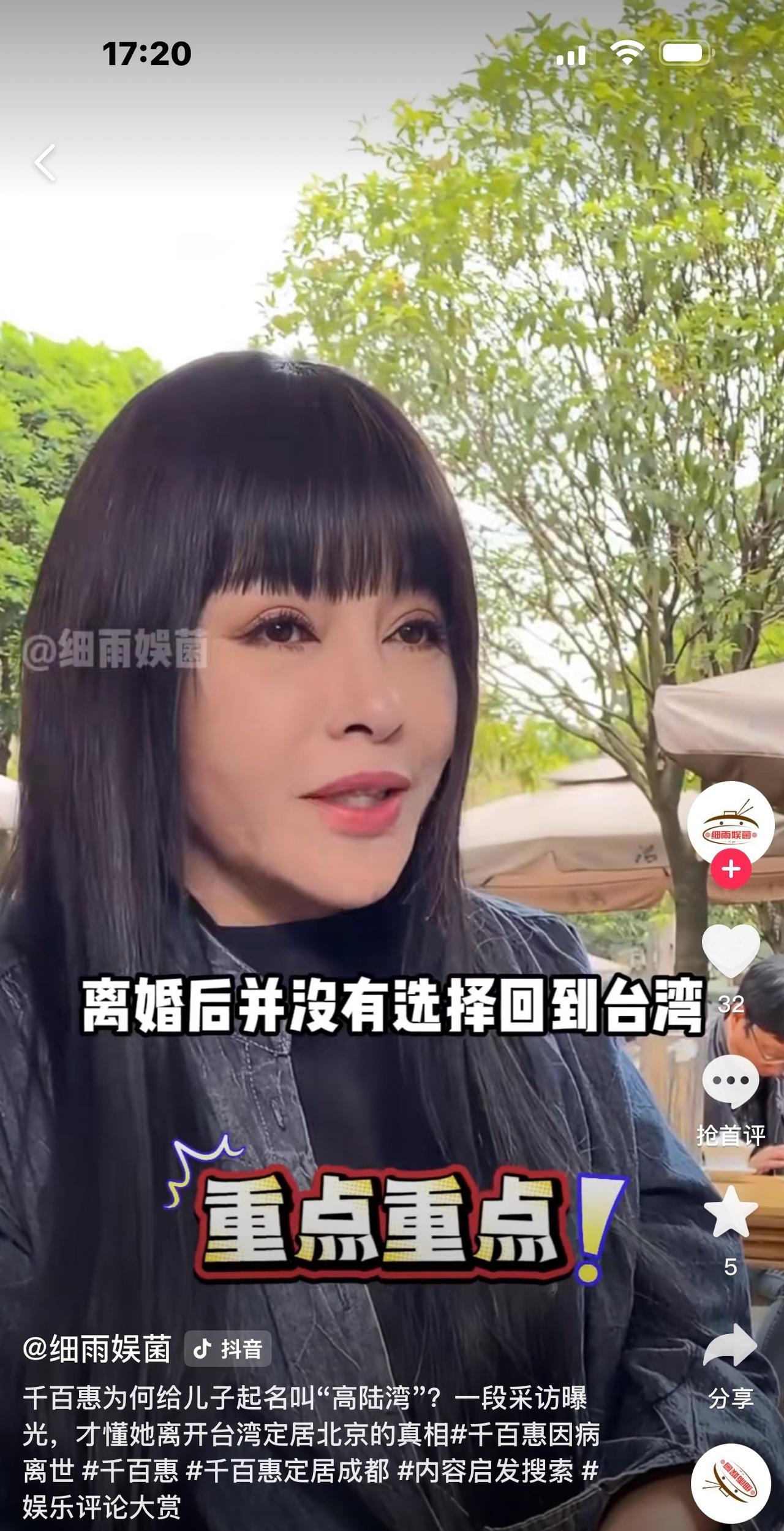 千百惠在成都买的房子,价值2800万,面积600平方!经纪人发言:千百惠猝然离世,很可能跟之前摔倒有关。 经纪人说,和千百惠签了5年合约,即将到期,千百惠的身体一直很健康,本来和她谈妥,今年11月准备和她续签合约,哪曾想她会突然离世,让他们难以接受。 不过他们认为,千百惠之前不慎摔倒过一次,可能给她造成了严重的影响,怀疑摔倒与突然离世有关。 据悉,2021年,千百惠搬到了成都,在成都买了房子,是一套小高层别墅,价值2800万,面积有600多平方,很宽大呀。 不过,千百惠买房子并不是为了投资,而是在成都定居,她和丈夫高大林离婚以后,并没有回台湾,而是和儿子高陆湾也在成都居住。高陆湾和父亲高大林一样,从中央音乐学院毕业,后赴美深造,曾创作歌曲《给时间一点时间》,寓意两岸关系终将迎来和解。 前两年,千百惠在网络平台晒出了她的成都身份证。当时网友好奇问千百惠:“你是在成都定居了吗?”千百惠回答很爽快,说“是的”。 千百惠很满意成都的环境,和邻居们关系很好,闲时,会和他们互动,她还学会了打成都麻将,虽然她还没有习惯吃很辣的口味,但是对成都的红糖滋粑情有独钟,特别喜欢。她还喜欢逛街,在成都的大街小巷留连。 连朋友都说,千百惠在成都的这几年生活是惬意的、无忧无虑的。 来到成都以后,千百惠还专门为成都写了一首歌,叫《留在成都》,里面有一句歌词是这样的:“渐渐熟悉每一条街地铁几号线,一起装扮温暖的家,宽敞房间……”,可见,她热爱成都,把那里当真正的家,也很有归属感。 看来,千百惠的适应能力很强,从台湾到北京,再到厦门,再到成都,她都能够很好地适应融入当地,没有把自己当外人。 在大陆生活了30多年,千百惠见证了中国的飞速发展,早就习惯了这边的生活,在内心里也认同祖国的统一,中国只有一个。今天,儿子高陆湾发文:妈妈唯一的遗憾就是没有看到家乡回归祖国! 2021年,千百惠在短视频平台晒出自己的大陆身份证,配文称“不管身在哪里,祖国都是我强大的依靠,为此我倍感自豪”,她还说“不要把我称为‘爱国艺人’因为热爱祖国理所应当。” [祈祷][祈祷][蜡烛][蜡烛]