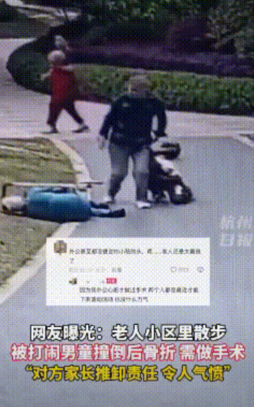 让人唏嘘!4月20日,江苏南京一小区内,两位刚做完手术不久的老人正在小区里慢慢散步,突然一个男童冲过来,直接把其中一位老人撞翻在地。