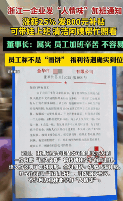 “这就叫良心企业!”浙江金华,一公司因下半年的订单多,董事长直接下达“人情味”加班通知!规定除特殊情况外,任何人不准请假,加班工资5点后算,同时全员涨薪25%,还会发放800元的高温补贴!更贴心的是,员工可以带娃上班,不仅有保洁阿姨照看,还可以吹空调看电视,完全不用家长操心!网友:好老板都是别人的! 金华的一家企业可算成了网络热点,原来这家公司后半年的业务大幅增加,董事长特意发布了一份规定,除生病或家庭重大事务外,原则上不批准请假,但同时推出了一系列配套福利。 下午五点后就可以拿到加班工资,而且全员涨工资四分之一,甚至还有800元的高温补助,不过最让员工觉得暖心的是,公司允许暑期带孩子来上班,并安排保洁人员协助照看,这解决了许多家庭照顾孩子的难题。 对此公司负责人回应说,订单增加确实需要加班赶工,但员工辛苦付出也应该得到回报,这些福利措施都是应该做的。 这份通知在网络上传播后,引发了不少讨论,许多人表示羡慕,称这是别人家的公司,觉得企业在订单增加时能够主动提高待遇、解决员工的实际困难,显示出对员工的尊重和关怀。 说白了,企业和员工之间是一个相互体谅、共同成长的关系,员工愿意在忙时多付出,企业也应当用实实在在的回报去认可他们的努力。 评论区谈谈,你们公司有没有让你觉得特别暖心的制度?