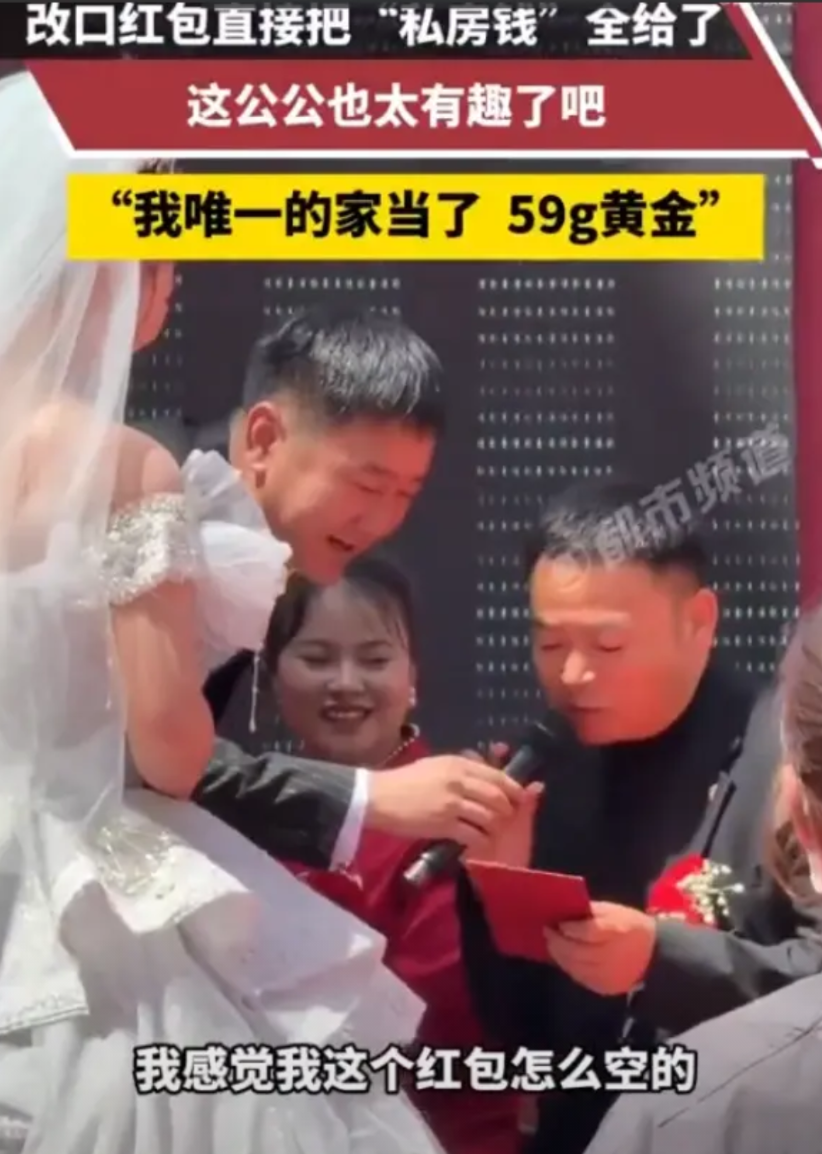 “这个公公能处!”4月17日,河南一场婚礼上发生了惊险又暖心的一幕。公公在给儿媳妇改口红包时,发现红包竟然是空的。面对这个尴尬局面,他急中生智,当众摘下自己59克重的金手链送给儿媳,成功化解了危机,赢得了全场掌声。