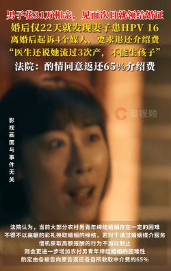 “这婚结得太草率了!”江西,一男子拿出31万进行相亲,结果和相亲对象才刚见面,次日就领了结婚证!可没成想婚后仅22天,男子就发现妻子患有HPV16,而且医生还表示妻子流过3次产,根本没法生孩子!男子觉得遭到欺骗,一气之下就离了婚,随后还把4个媒人告上法院,最终法院这样判了!网友:这就是闪婚的代价! 江西这位小伙因为年纪不小了,家里催婚催得急,就在去年11月通过四个媒人介绍,认识了女方,让人目瞪口呆的是,这两人第一天见面觉得还算合眼缘,第二天就领了结婚证,这速度快得连媒人都暗自咋舌。 办手续当天,他们还顺道做了婚前检查,小伙和媒人签了婚介服务合同,合同里明确写着如果女方出现出轨、离家出走等情况,所有礼金必须全额退还,为了这门亲事,小伙前后总共花了31.2万元,其中包括彩礼和媒人介绍费。 谁曾想,新婚的甜蜜还没尝到,结婚第22天,女方的体检报告就显示她感染了HPV16型病毒,这是最容易引发宫颈癌的高危型病毒之一。 更让小伙无法接受的是,从医生那里得知,女方因为之前做过三次流产手术,生育能力很可能已经受到影响,而这些重要情况,女方在结婚前只字未提。 小伙觉得受到了欺骗,两人很快办理了离婚手续,虽然婚离了,但小伙越想越气,一纸诉状将四个媒人全都告上了法庭,要求退还介绍费。 法院审理后认为,现在农村大龄男青年结婚确实不容易,如果对婚介服务中收取高额费用却未尽到如实告知义务的行为不加以规范,只会让农村青年的婚姻之路更加艰难。 虽然媒人确实促成了这桩婚姻,但这段关系仅维持22天就因一方隐瞒重要健康情况而破裂,最终法院判决四名媒人各自将所收介绍费的65%退还给小伙。 这个判决既肯定了媒人的劳动付出,也明确了婚介服务应当尽到的信息核实责任,婚姻介绍不是一手收钱一手交人这么简单,特别是涉及到可能影响婚姻稳定的重要信息,媒人应当进行必要的核实和告知,收了高额费用,却没有确保信息的真实性,媒人理应承担相应责任。 大家讨论讨论,你觉得这个结果如何呢?结婚前有必要做婚检吗?