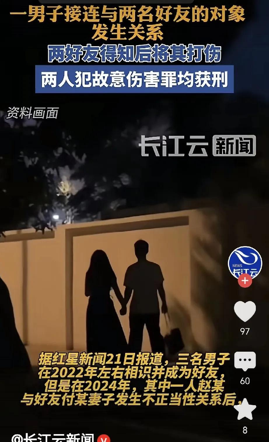 甘肃,一男子不讲义气,和两个好朋友妻子都发生了关系,他还到处炫耀,觉得自己可有本事,不久被朋友发现,男子跪下求饶,俩好友一起,把他暴揍了一顿,男子被打成轻伤,俩好友被送上法庭,男子拒绝谅解,法院的判决,令人意想不到! 2025年8月21日,长江云新闻报道了一件奇葩之事,一男子占有俩朋友妻子,被朋友殴打,他不思悔改,反而不原谅朋友。 2022年时候,付某认识了赵某,俩人投缘,很快就成了朋友。 随后,付某和赵某在交往中,赵某带来王某,三人相见恨晚,互相成为了朋友。 随后,三人经常在一起聚会,吃饭喝酒,3个人都带上了自己的家属。 2024年的时候,赵某结识了付某的妻子,付妻虽然已经结婚,依旧动人。 赵某不顾及兄弟情义,渐渐对付某妻子有了心思。 他大献殷勤,对付妻甜 言 蜜 语,付妻心动,和他约会,赵某很快就和她发生了关系。 赵某得手之后,得意洋洋,他当做战绩,向另一位好友王某炫耀。 王某心里一惊,责怪赵某对不起朋友,俗话说朋友之妻,绝不可欺! 赵某嘿嘿一笑,不以为然,自己的快乐,才最重要。 自此以后,王某看赵某品行不端,开始刻意对他远离。 王某没有结婚,和朋友聚餐,每次都会带上自己的女友。 赵某占有付某妻子之后,他的目标很快转移。 别的女子他接触不到,他又把眼光投向了王某女友。 他又使用各种手段,暗做手脚,开始热烈追求王某的女友。 他小恩小惠,还是那一套功夫,王某女友看他热情,很快被他哄到了手。 赵某趁王某不在,找到王某女友,不加考虑,也用同样的方式,和王某女友也发生了关系。 至此以后,两位好友都被他绿,他左右逢源,沾沾自喜,同时占着两位好友的妻子女友。 王某发现,女友对自己不如从前,他预感不好,难道说被赵某使了手脚,也来哄骗了自己女友? 自从赵某告诉王某,他已经占有了付某妻子,王某防之又防,唯恐自己的女友被他打上主意。 果不其然,还是被他钻了空子,果然是好兄弟,专门打兄弟主意。 王某满脸怒气,一把抓住赵某的领子,质问他为何非要这样做,非要破坏兄弟情义! 赵某看王某瞪着眼睛,他膝盖一软,立刻给王某跪下: 兄弟对不起,你原谅我吧! 王某抡起巴掌,一巴掌呼到赵某脸上,你占了付某妻子,又跑来占我女友便宜! 你没一点道义,专坑朋友,你哪来的脸面,跪我面前? 说完之后,他两巴掌上去,左右开弓,也打不出心中怒气。 王某叫来付某,和赵某当场对峙! 赵某咬紧牙关,死不承认,你俩无凭无据,凭啥合伙跑来质问。 王某扇了他两大嘴巴,朝他左边大胯上连踢三脚。 王某还不解恨,又用膝盖,在赵某后背上顶了两下。 付某这时才知,赵某早就和妻子发生了关系,他气的直打哆嗦,打开后备箱取出一根棒球棒,对着赵某后背打了过去。 他不解恨,又拳脚相加,对着赵某不断殴打。 打了一阵,俩人出了口恶气,付某王某开车带赵某回去。 谁知半路被警方发现,赵某被打的鼻青脸肿,经过司法鉴定,赵某被打成轻伤一级。 审理期间,付某王某认罪认罚,主动承认殴打了赵某。 民警走访了付某家小区,得到she区的评 估意见,决定对付某实行缓刑。 但是,赵某对王某打他,恨之入骨,绝不原谅他对自己动手。 《刑法》第234条规定: 故意伤害他人身体的,构成故意伤害罪。 在本案中,付某和王某对赵某实施了殴 打,导致赵某轻伤一级,付某和赵某的行为符合故意伤害罪的构成要件。 付某用棒球棍击打赵某后背,王某对赵某进行拳打脚踢,他们明知自己的行为会造成赵某身体伤害,并且希望或放任这种结果发生,客观上造成了赵某轻伤的后果,因此构成故意伤害罪。 《关于常见犯 罪的量刑指 导意见(试行)》规定: 对于积极赔偿被害人经济损失并取得谅解的,综合考虑犯罪、赔偿数额、赔偿能力及认罪、悔罪程度等情况,可以减少基准刑的40%以下。 积极赔偿但没有取得谅解的,可以减少基准刑的30%以下。 尽管没有赔偿但取得谅解的,可以减少基准刑的20%以下。 在本案中,付某和王某虽然认罪认罚,但赵某对王某不予谅解。 《刑法》第74条规定: 对于累犯和犯罪的首 要分子,不适用缓刑。 本案中,付某和王某不属于累犯和犯罪的首 要分子,理论上有适用缓刑的可能。 法院根据she 区 评 估意见,认为付某的情况,没有重大 不 良 影响,可适用缓刑。 赵某坚决不谅解王某,因此,法院认定,王某不符合缓刑的适用条件。 最终,一审判决,付某犯故意伤害罪,判有期徒刑8个月,缓刑1年6个月。 王某犯故意伤害罪,判有期徒刑1年2个月。 对此,你怎么看?欢迎评论区留言讨论。 关注@王哥说法 学法律知识。#头号创作者激励计划#
