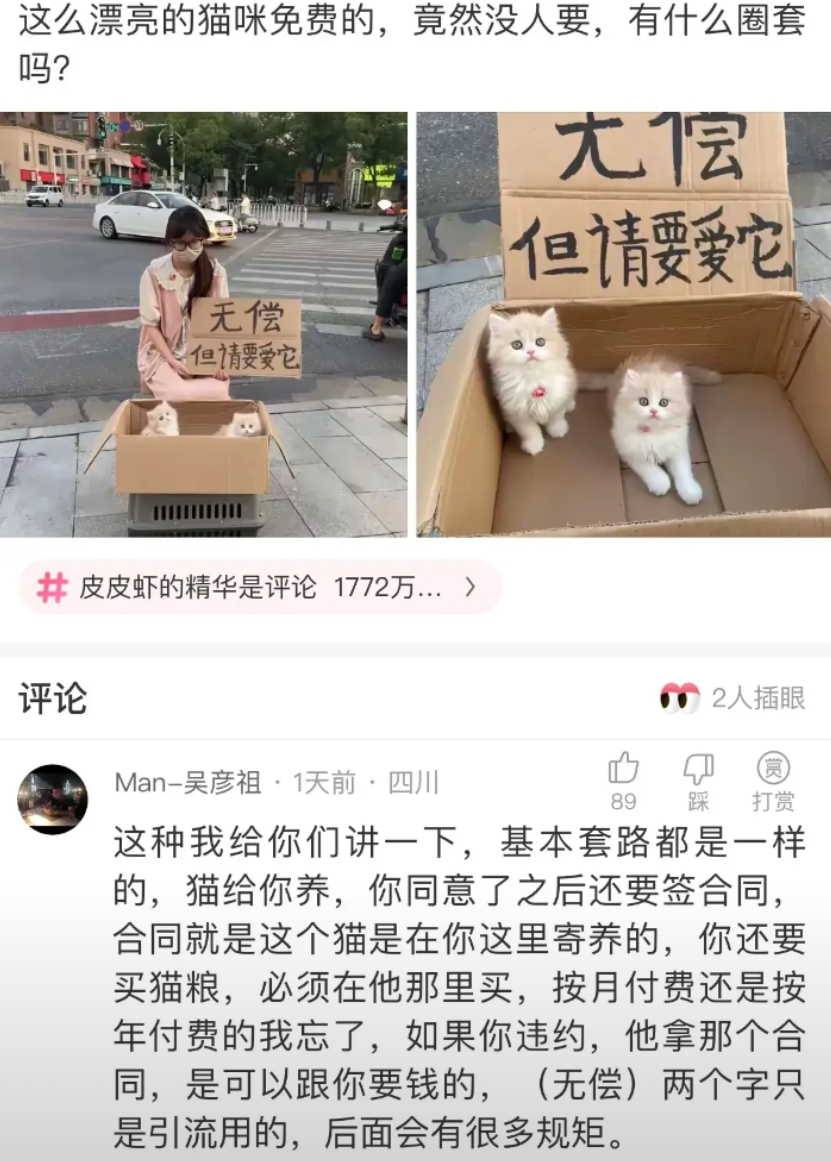 看评论大城市套路深,我们这有无偿养猫养狗的,只要求你好好对待它们就行了,如果哪天不想养了,一定给安排好。