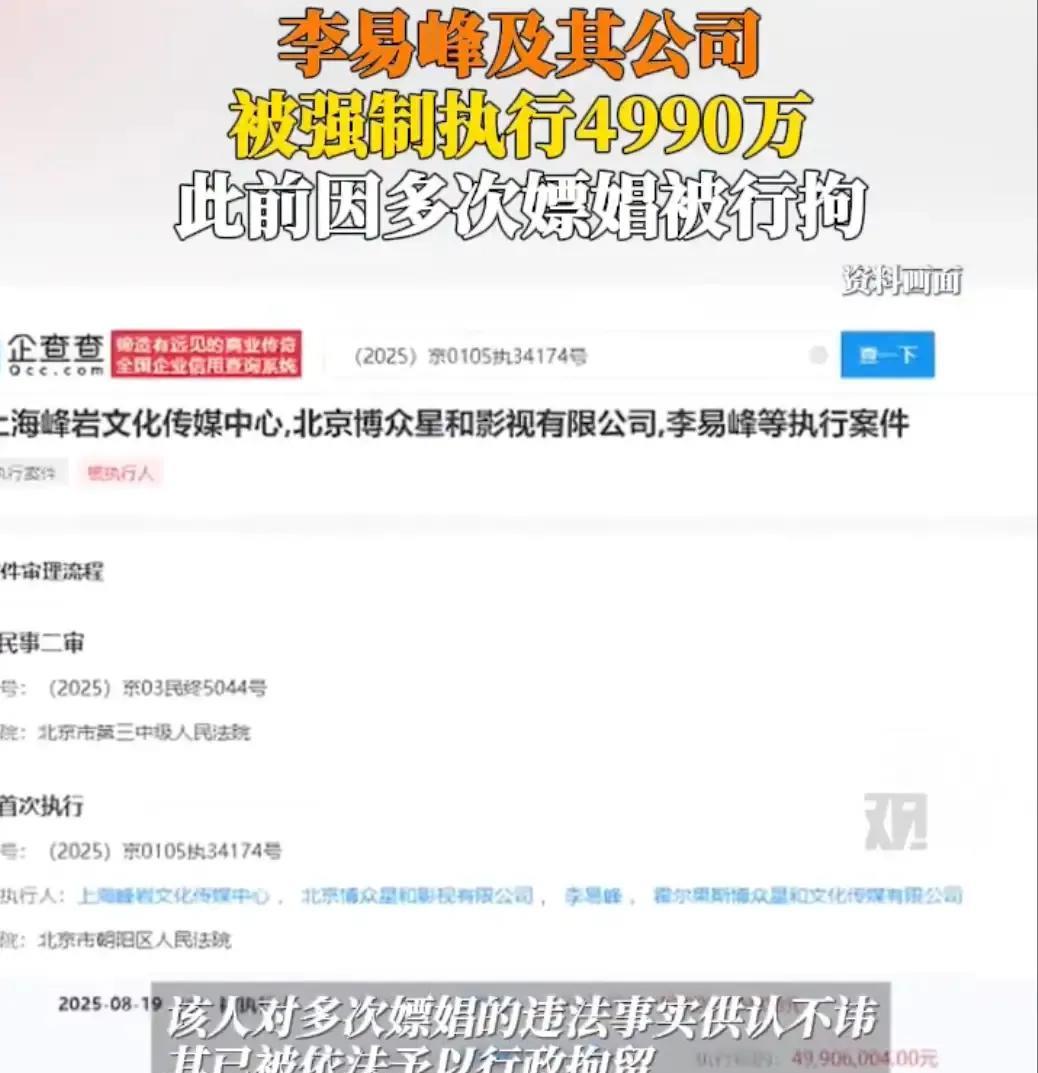 从顶流到被执行人,李易峰的“坠落” 2025年8月,一条消息震惊全网:李易峰及其名下公司被法院强制执行4990万元。 回想起2022年,李易峰因嫖娼被行政拘留,形象瞬间崩塌,演艺事业全面停摆,代言解约、作品下架。这次强制执行,大概率是源于此前合作中断产生的巨额违约金。 从昔日风光无限的顶流明星,到如今的被执行人,李易峰的经历让人唏嘘,也给娱乐圈敲响了警钟,公众人物一旦触碰道德与法律红线,必将付出沉重代价 。