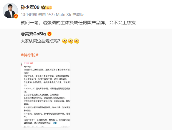今天下午,有博主给特斯拉Model YL,做了九条分析,孙少军看到之后,问大家: