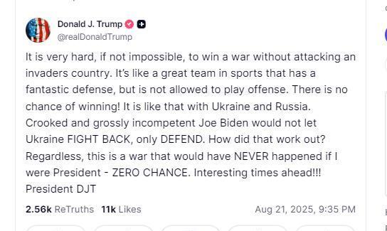 特朗普自曝美国家丑, 公开对外披露了一个前所未有的丑闻。 美国总统特朗普今晚(美国时间21日)说道,“不攻击侵略国就赢得战争,即使并非不可能,也非常困难。这就像体育界一支防守出色的队伍,却不被允许进攻。根本没有获胜的希望!乌克兰和俄罗斯就是如此。狡猾无能的乔·拜登不让乌克兰反击,只允许其防守。结果如何?无论如何,如果我是总统,这场战争就永远不会发生——机会为零。未来充满希望!!” 也就是说,特朗普自曝了美国的家丑:一手操控了当下的俄乌冲突,并使其无限期拖延,并不允许乌克兰进行真正有威胁的反击和进攻,以使得当下的俄乌战争陷入持续的胶着之中,以使美国从中渔利:一方面,试图拖垮俄罗斯;另一方面,使得欧洲公开有求于美国,并且美国还将包括乌克兰在内的欧洲多国拿捏在美国手中。