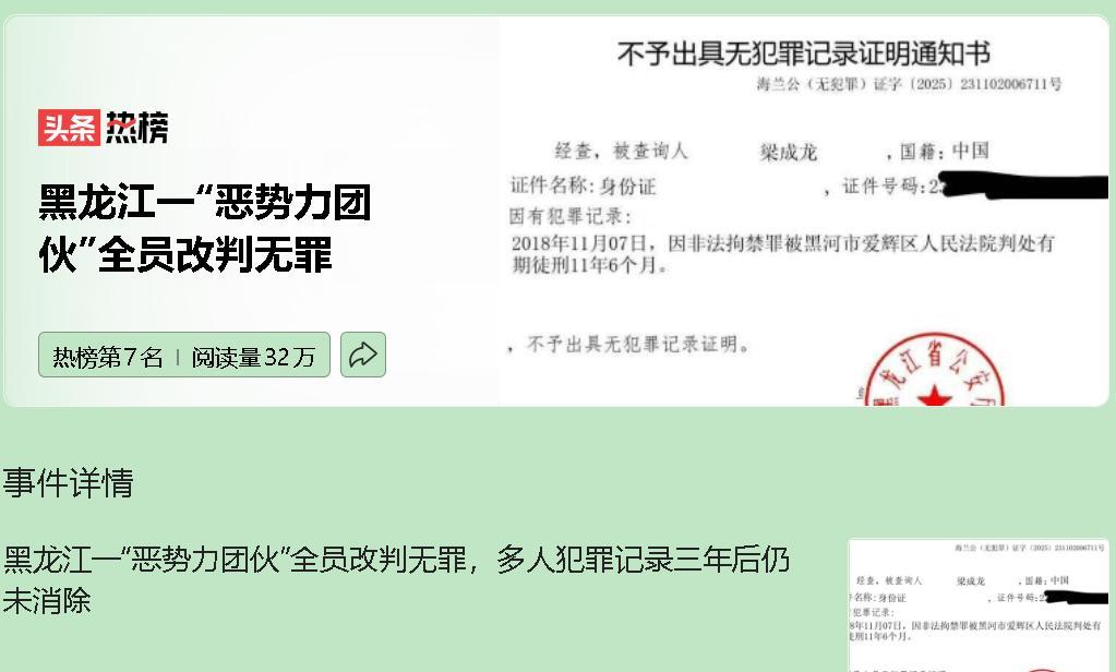 黑龙江梁明等13人三年前被法院改判无罪,但公安系统依旧显示他们有犯罪记录。席志丽等人最近申请无犯罪证明时,系统还写着“判刑5年6个月”,导致证明无法开出。法院已经判清白,系统却像死了心一样不更新,这到底是哪里出了问题? 改判无罪只是第一步,案底不清零,生活照样被拖累。贷款被拒、工作受限、孩子政审受阻,这些现实问题没人替他们解决。司法的公信力,正被这些细节一点点消磨。下一步,谁来打通这“最后一公里”?#黑龙江一“恶势力团伙”全员改判无罪#