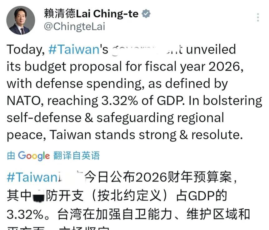 赖清德8月21日晚发文写道:“台湾当局今日公布2026财年预算案,其中防务开支(