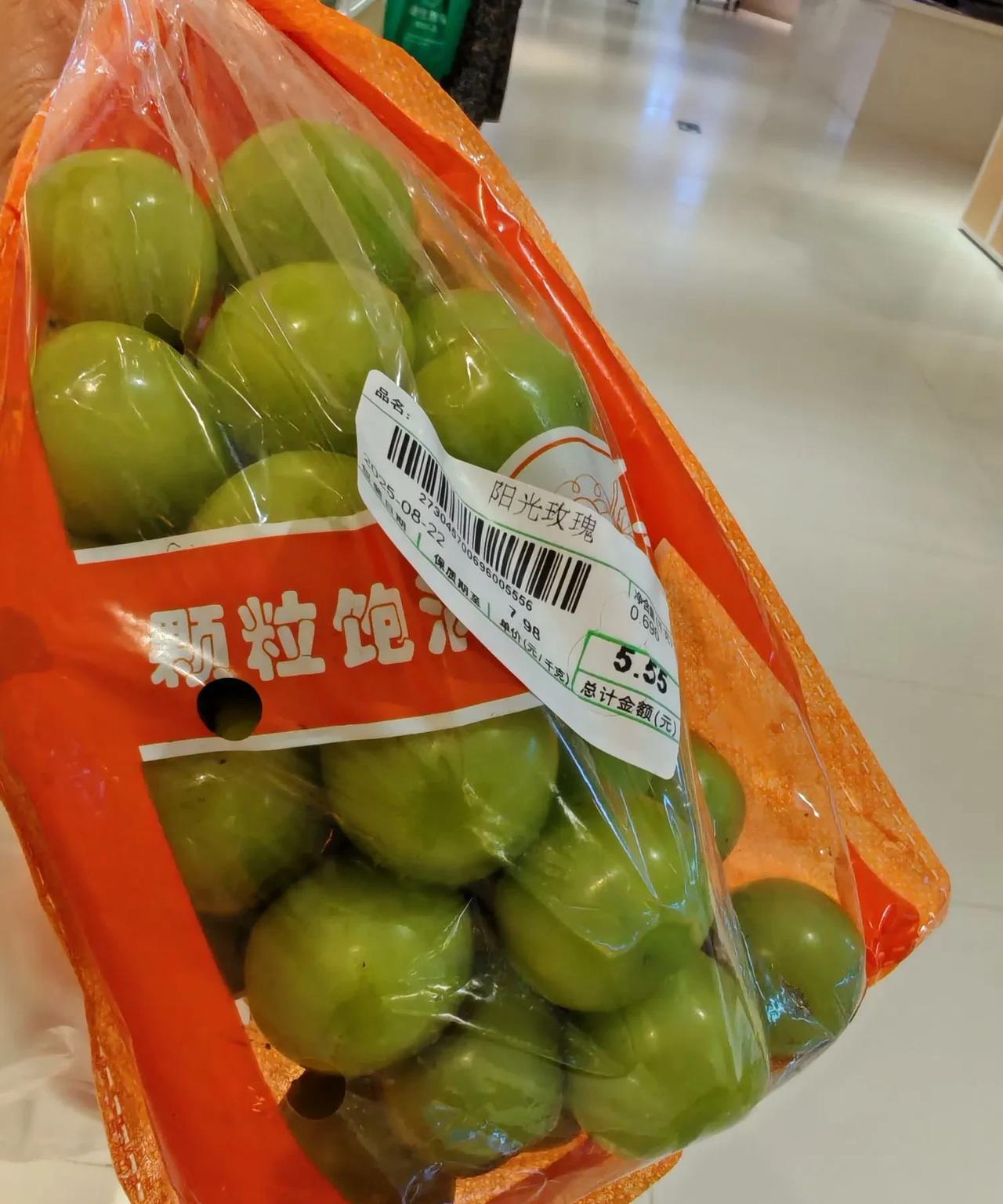 2025年8月22,今天我又买了这种葡萄。 2015年,我记得第一次买这个葡萄的时候,不叫阳光玫瑰,名字叫晴王,那时候80元1斤,我买了一串花了158,香香甜甜,爱不释手,还有点舍不得吃。 今天买了一串,3.99元1斤,才花了5.55元,口感还是那个口感,颜色依然是那个颜色,甜甜的,并带着一股淡淡的花香味,这十年,一路看着它崩盘,尽管名字变了,从晴王改成了阳光玫瑰,从最初的舶来品变成大路货,从单价80元,50元,30多元,再到今天的4元,它还是它。 尽管网上有人说现在的阳光玫瑰不好吃,说用药水过多,不放心,说句公道话,现在的水果应该跟种庄稼一样,规模化种植,都要打药的,或许就跟炒菜加点鸡精一个道理,没必要“谈药色变”,谨慎是应该的,适量吃应该没啥问题。