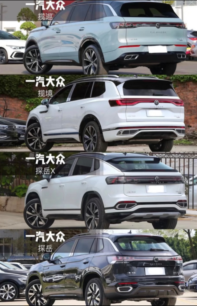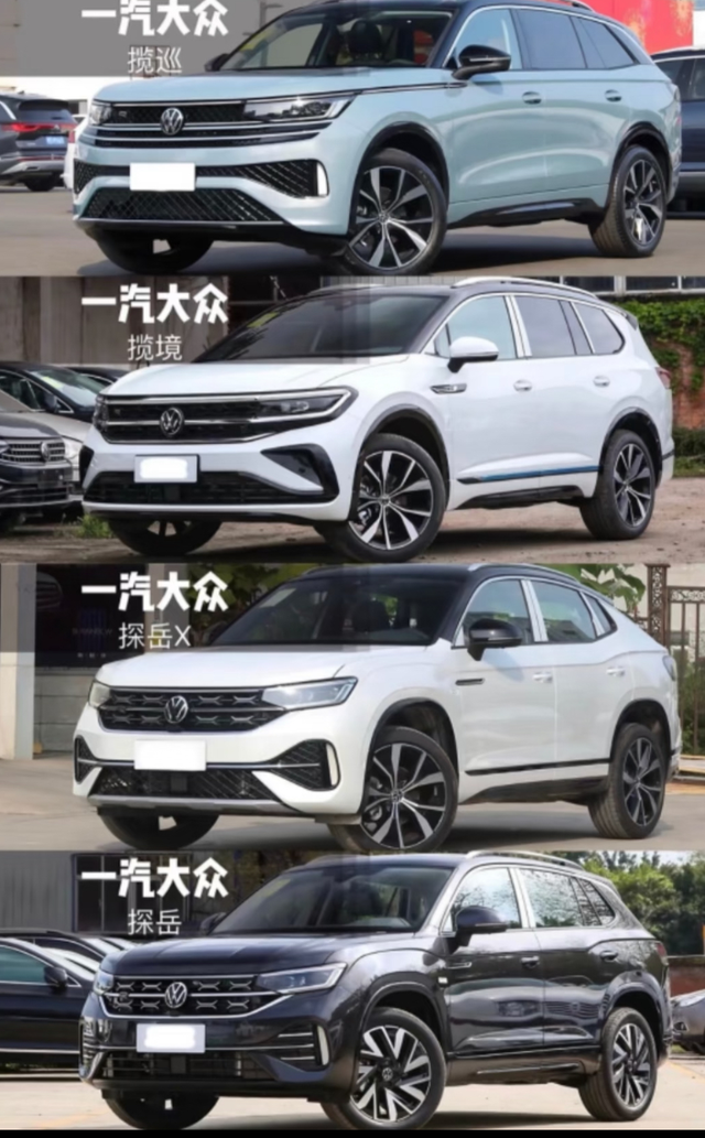 探歌:10 - 14万元,时尚先锋,专为年轻人和小家庭打造,油耗低,驾驶轻松。 探岳:14 - 16万元,中型SUV典范,空间大、动力强,家用商用都合适。 揽巡:18 - 25万元,大五座设计超舒适,内饰豪华,适合大家庭出行。 揽境:24 - 28万元,中大型SUV,配置拉满,动力澎湃,尽享舒适驾乘体验。