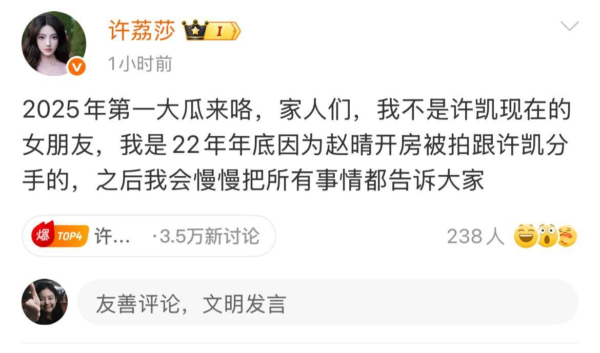 #许凯赵晴恋情# #许荔莎# #许荔莎自曝因许凯出轨赵晴分手# 哇,超大瓜空降! 剧情比暑期档还抓马。 完全没猜到这种走向。 先不急着站队。 蹲个后续, 再看两眼。[吃瓜群众][吃瓜群众][吃瓜群众][吃瓜群众][吃瓜群众][吃瓜群众]