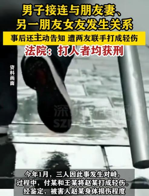 “关系太乱了!”甘肃宕昌,一男子与好友妻子偷偷发生关系,事后还将此事告知另一位朋友炫耀。朋友考虑到三人之间的关系并未戳破,谁知一个月后,男子就与朋友的女朋友发生了关系。两位好友得知后气愤不已,联手殴打男子,导致对方全身多处受伤。男子事后拒绝调解,将两名好友告上法院。法院的判决结果令人气愤! 2022年,赵某与付某因一场聚会相识。两人迅速成为朋友,随后付某将好友王某引荐给赵某,三人由此频繁往来,友谊日渐深厚。他们常到彼此家中做客。 那个时候,付某与妻子已婚,王某正与女友热恋并同居。赵某本人也已结婚,各自拥有着看似稳定的生活。赵某相貌英俊,风趣幽默,言谈颇具吸引力。 与付某和王某相比,赵某私下里还结识了付某的妻子和王某的女友。他与她们保持着密切联系,在三人相识的两年时间里,赵某持续私下与两位朋友的伴侣保持着不为人知的联系,这份友谊的根基正在悄然动摇。 2024年11月,赵某利用与付某的朋友关系,趁付某不在家时,偷偷约出付某的妻子。他与付某妻子发生了不正当关系。 事发之后,赵某对此事毫无愧疚之意。他甚至将与付某妻子发生关系一事告诉了王某,似乎将此视为一种个人“成就”。 王某得知此事后,内心复杂挣扎。他为维系与赵某的友谊,选择了暂时隐忍,并劝赵某尽快断绝这种不当关系,希望他能悬崖勒马。 然而,赵某并未听从劝告,行径反而变本加厉。仅仅一个月后,他再次与王某的女友也发生了关系,彻底突破了朋友间的道德底线。 几天后,王某知晓了赵某与自己女友的事情,王某此前积压的愤怒瞬间爆发,他感觉自己受到了彻底的羞辱。他当场质问赵某,要求其给出解释。 赵某见事情败露,自知无法抵赖。他当场下跪认错,苦苦乞求王某的原谅,姿态卑微,王某怒不可遏,情绪失控。他上前扇了赵某嘴巴两下,接着在其左大胯或胯部踢了两三脚,又用膝盖顶撞了赵某的后背两下。 王某随后将赵某的背叛行为告知了付某。付某闻讯后同样无法忍受,愤怒至极,立即与王某一同驾车找到赵某再次对峙。 在对峙过程中,赵某否认了与付某妻子发生过关系。付某随即从车后备箱取出一根棒球棒,对着赵某的胸口、背部等部位接连挥打。 王某也再次动手,扇了赵某耳光并踢踹他几脚。在被付某和王某驾车带走途中,赵某设法拨打了报警电话求救,警方迅速响应,在路上截停三人,并将他们带回派出所接受调查。 两人均表示愿意对赵某进行赔偿,并希望能够获得赵某的谅解,以期获得从轻处罚。法院综合考虑后,决定对二人从轻处罚,赵某坚决不接受任何赔偿,并且明确表示不谅解王某。赵某的态度直接影响了法院的量刑。 此案公布后,立即在社会上引发了广泛热议,许多人感慨交友不慎,引狼入室,对赵某的行为表示强烈谴责,也有不少网友认为,赵某作为事件的直接引发者,这样的行为也应受到惩罚。 赵某的行为虽然在道德层面令人不齿,遭受社会谴责,但因为并未构成刑事犯罪,无法通过刑法惩处,赵某的行为并非无需承担责任。其妻子在离婚时,可基于赵某的过错,依法向其要求民事赔偿,保障自身权益。 付某作为婚姻的受害者,同样有权依据相关规定,向自己的妻子追究相应的民事责任。王某与女友虽是情侣,也可参照此规定主张权益。 在现代社会,即便面对极端的道德挑衅,公民也应回归法律框架寻求解决,而非诉诸以暴制暴。否则,施暴者终将付出法律代价。 对此,你怎么看?