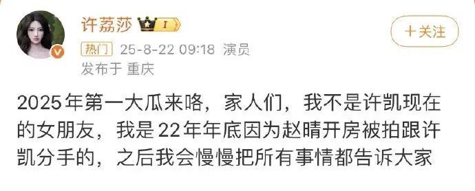 最近娱乐圈的大瓜一个接一个,这次轮到许凯被推到风口浪尖!许荔莎自爆曾是许凯的女友,直言2022年底,她亲眼看到许凯和赵晴“开房被拍”,一怒之下选择分手 ,还暗示许凯出轨,甚至放出牵手照、聊天记录截图,其中许凯跟朋友吐槽她的内容,让一众吃瓜网友惊掉了下巴。 消息一经曝光,迅速在网上掀起轩然大波。于正坐不住了,赶忙在直播间澄清,坚称许凯和赵晴只是普通同事关系,安排赵晴给许凯辅导台词罢了。可大众并不买账,毕竟狗仔镜头可不会说谎,2022年就曾拍到许凯与赵晴在高铁站甜蜜相拥,而后又牵手回酒店,这亲昵程度可不像是普通同事能有的行为。 许凯工作室也匆匆下场,声明许凯目前单身,还称2021年和许荔莎拍完戏后就没再联系。但这些回应,都没能挡住网友们的质疑声浪。