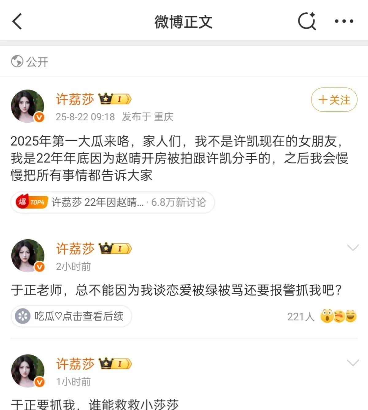 于正怕不是要气死了, 自己旗下的许凯、赵晴, 居然被一个十八线艺人许荔莎做局了! 许荔莎今天突然翻出一件陈年旧事, 声称自己被许凯绿了,还扯上无辜的赵晴。 且不说她手里到底有没有实锤, 偏偏选在这个节骨眼上爆瓜, 说没有算计,谁信啊! 于正是出了名的护犊子, 许凯《之夜归》正在热播, 赵晴《凡人修仙传》后人气大涨, 二人正是事业上升期,被人这么搞事情, 气得于正直接报警!