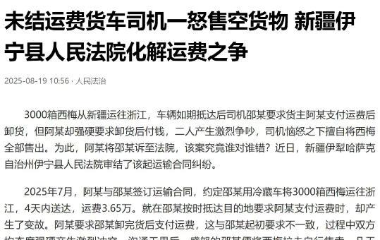 新疆伊犁哈萨克,男子开着冷藏车,运了3000箱西梅到达目的地后,他要货主先付了运费36,500元,再卸货,货主却不同意,要求先卸货,再付运费,两人意见不一,大吵了一架,男子也不要运费了,一怒之下把车开走,然后他自己把西梅给卖了,货主恼怒了。 张先生(化名)是一名货运司机,他的货车还是冷藏货柜的那种,基本上张先生拉的都是一些需要大冷的物品,有时候是一些高价的水果,有适合则是一些需要冷藏保险的肉类! 在家休息了一段时间后,张先生准备再次出车挣钱,没多久的时间,他就接到了一个订单,需要他这种冷藏车,将一整车的西梅运往浙江,整个过程必须打冷,并且这趟的运费比较高,一趟下来运费总共36500元! 他非常幸运的抢到了这个订单,随即发动车辆前往指定的地方进行装货,工人在一箱箱的往车厢里面进行搬运,张先生也按照货主的要求,早早的就打开冷藏柜的大冷机,将里面的温度降低,因为西梅必须得在合适的温度存放,否则将会发生质变! 并且货主要求他必须在4天内将这3000箱的西梅送达,这样才能够保证西梅足够新鲜,因为他们也要进行售卖,所以才会出这么高的运费,就是为了让西梅能够妥善的到达! 张先生也知道时间紧任务重,他全程高速驾驶,途中只要不是自己吃饭上厕所,他基本上不进入服务区休息,每天的睡眠时间非常的少,并且一直查看冷藏柜里的温度,确保大冷机在正常工作,害怕因为自己的失误,造成意外的发生,可以说他十分认真对待这次货运! 终于张先生在规定的时间内,将整车的西梅安全的送达,来到指定地方后,张先生将车辆停靠在即将卸货的地方,随即看到老板便告诉对方,需要先支付一下这趟的运费,才能够让货主进行卸货! 因为张先生之前就吃过这种亏,所以他不想再吃亏只能要求货主先支付运费,然而收货方的老板却不认可这一行为,认为他必须先卸货,并且将货物验收一遍,才能给张先生支付运费! 双方并没有达成一致,并且还发生了一些争执,张先生一气之下,直接将车辆连同西梅一块开走,随即他便打算,这里肯定有人收西梅,既然对方不肯支付运费,他就找到了一家肯收这些西梅的商家,以15万元的价格,将整整3000箱西梅卖给了对方! 这件事很快也被这些西梅的老板得知,认为张先生不遵守行规,直接将张先生起诉到了法院,经过法院的多方面调查,认为双方在这件事中,都存在着过错! 最终判决张先生扣除自己的运费之外,将剩下的货款进行归还,并且赔偿对方的损失! 那么,对于这件事,大家有什么看法? 信源:人民法治 2025-8-19