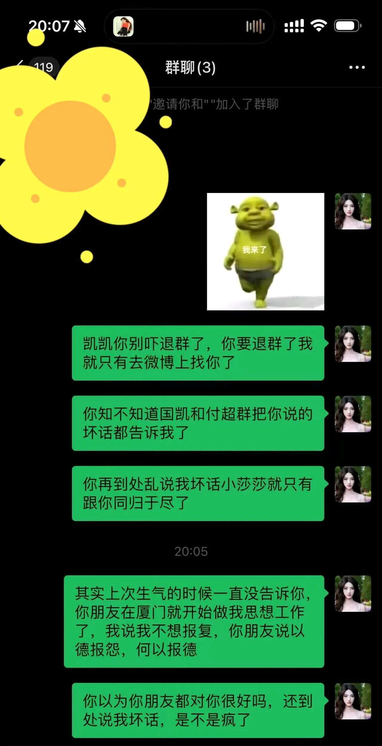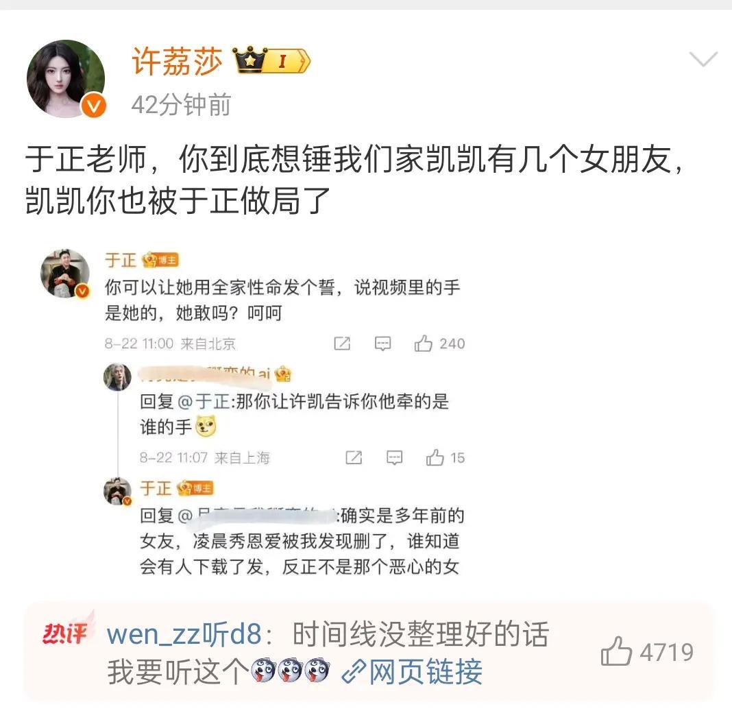 许荔莎、许凯、赵晴上午的八卦新闻到现在还挂在微博热搜榜上。虽然不认识这三位,但根据逻辑推理也知道这三人是新生代演员。今天上午青年演员许荔莎在微博上发文说前男友、演员许凯和演员赵晴开房出轨,并有聊天记录作为证据,要求给一个道歉,并转发以前一条许凯牵手某人的视频。对此对方演员公司负责人于正上网发文暗指这支没有身份的手不是许荔莎本人,而许荔莎回复说,那意思是许凯有好几个女朋友? 娱乐圈八卦新闻真是多。 随附上许荔莎分享的部分聊天记录。 下面的链接是许荔莎分享的许凯牵手某人的视频,似乎是想证明什么。