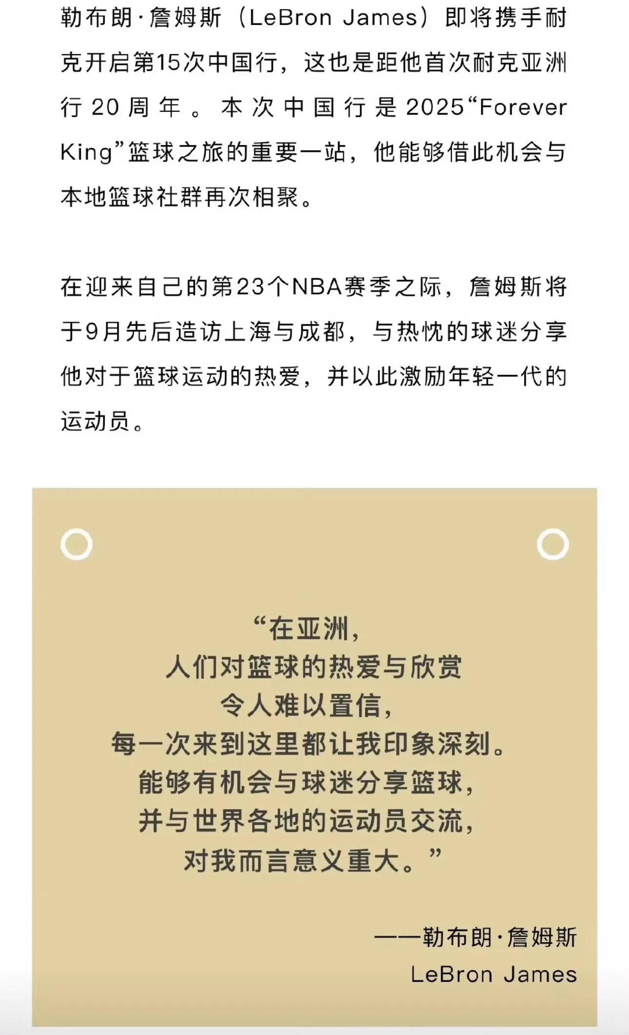 【成都】詹姆斯中国行即将来到成都!“詹姆斯中国行”今日正式官宣!此次...