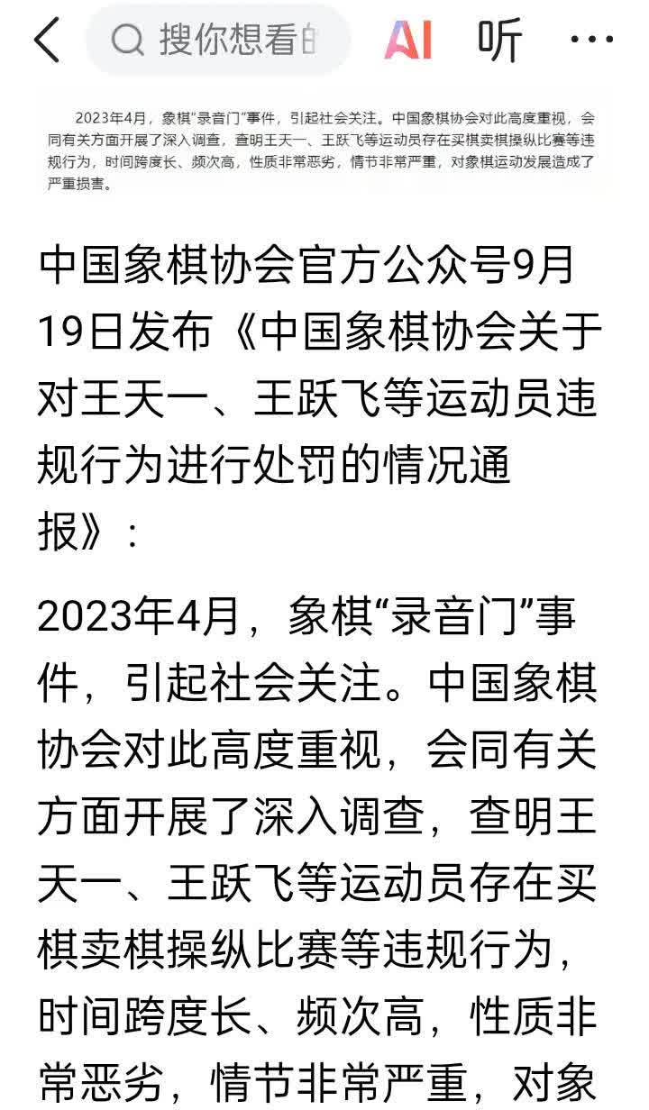 在处理象棋录音门事件中,前任棋协领导在没有洞察引发棋坛乱象的真实根源的前提下,不能主动承担长期、大面积买卖棋、涉事众多棋手塌方式重灾,不去自醒反悟,而是把处罚力度本末倒置的全部倾注在棋手的错误之中。[捂脸] 还能堂而皇之的把在棋坛买卖棋中,并不是最严重的中象第一人王天一,用什么浓烈的修辞"买卖棋时间跨度长,频次高,行为非常恶劣,情节非常严重”等等,有违实情的描述,并用终身禁赛的严厉处罚告之天下。请问前任棋协领导,你们的这些根据出自何处?你们这种草率的决定是不是在显示权力的喧嚣? 难道说在做出这样决定的同时,你们没有一点负罪感,一点都不脸红?把自身的错误洗得一干二净,恬不知耻对众多涉事棋手下刀,怎么去面对你们长期的业内监管,怎么去心安理得的领取薪酬的犒劳?[石化]