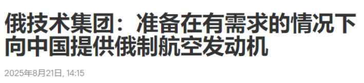 8月21日,据俄媒报道,俄技术集团总经理谢尔盖·切梅佐夫表示:如果有需求,该公司准备向中国提供俄罗斯航空发动机。