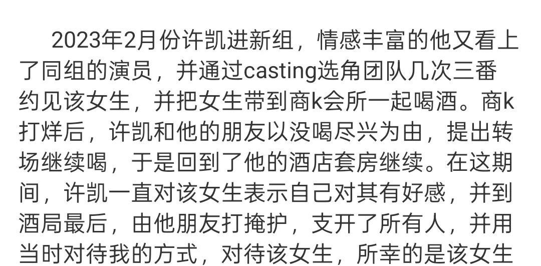 许荔莎继续爆料许凯,并总结了时间线,其中提到了许凯两次醉酒试图亲吻女性。 所以,娱乐圈男明星的酒局并不是聊聊天而已?而是去选目标了?如果不是男女关系,借着酒劲试图肢体接触女性,是不是属于性骚扰?如果还有脱衣服等举动,是不是属于那啥未遂? 贵圈太乱了。