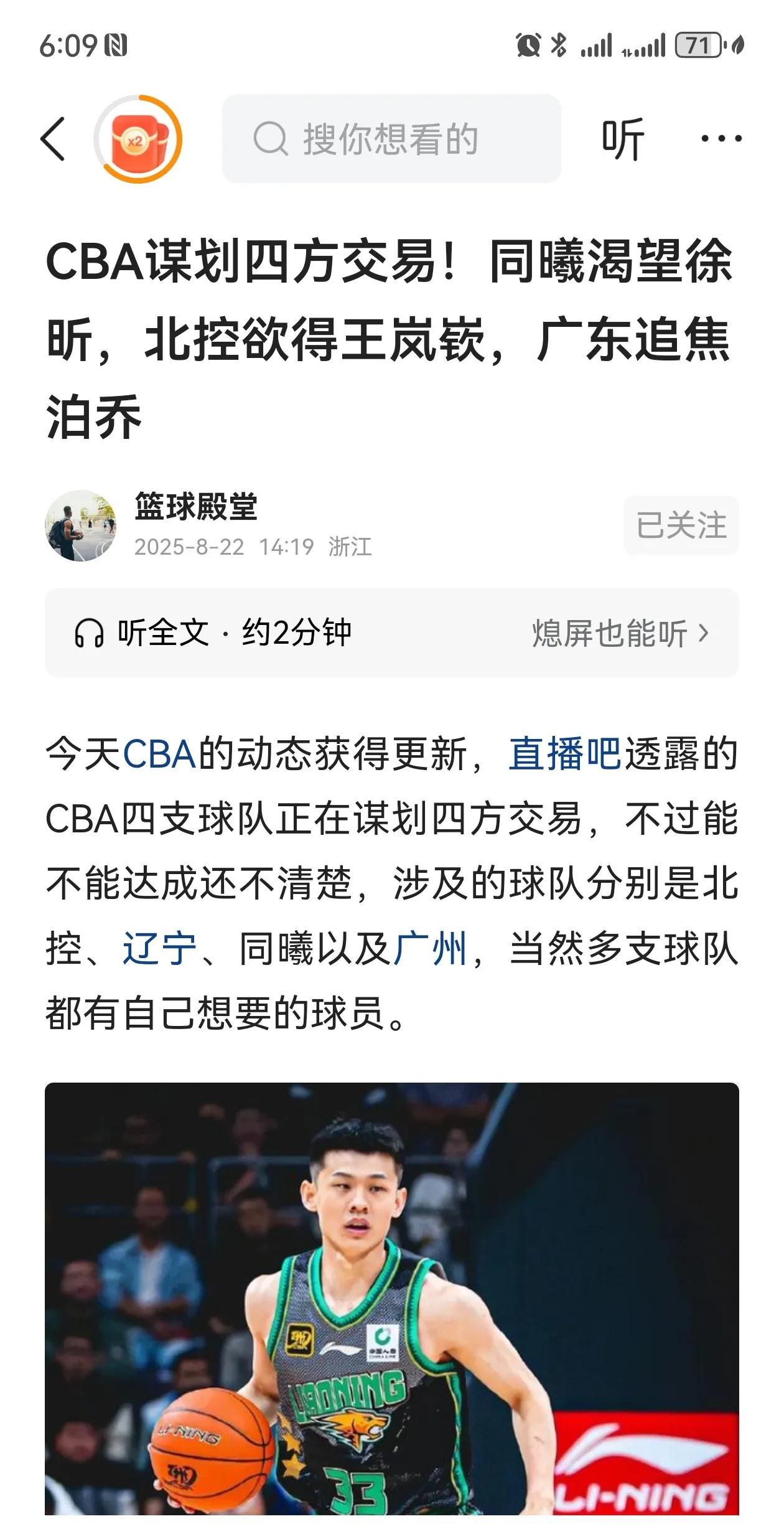 国家队结束,CBA流言四起[灵光一闪]! 1. 朱芳雨拿黄明依加夏振峰换焦泊乔 2. 辽宁想交易张镇麒 3.北控想靠四方交易得到王岚钦 广东想要一个主力中锋,是人尽皆知的事情。虽然说广东有徐昕,但下赛季他是否会留下来还不确定,即使留下来了,也很难说能否达到杜锋的要求。不过,广州队是要焦泊乔换钱的,这个交易很难达成。 现在张镇麒的问题是他年薪只有150万,他肯定寻求一份顶薪,但他又迟迟不肯手术,加上辽宁觉得他运动能力下降,不值顶薪。别说不可能,郭艾伦,郭仕强都搞走了,一切皆有可能。 北控想要一个一号位是非常的迫切,当初,朱总屁颠屁颠跑去谈陈国豪北控就狮子大开口要徐杰。现在看准了辽宁想交易张镇麒,马上叫上同曦,辽宁,广州搞一个四方交易,但我觉得可能告吹,因为难度太大,CBA还不是NBA,交易制度没这么成熟[灵光一闪]。