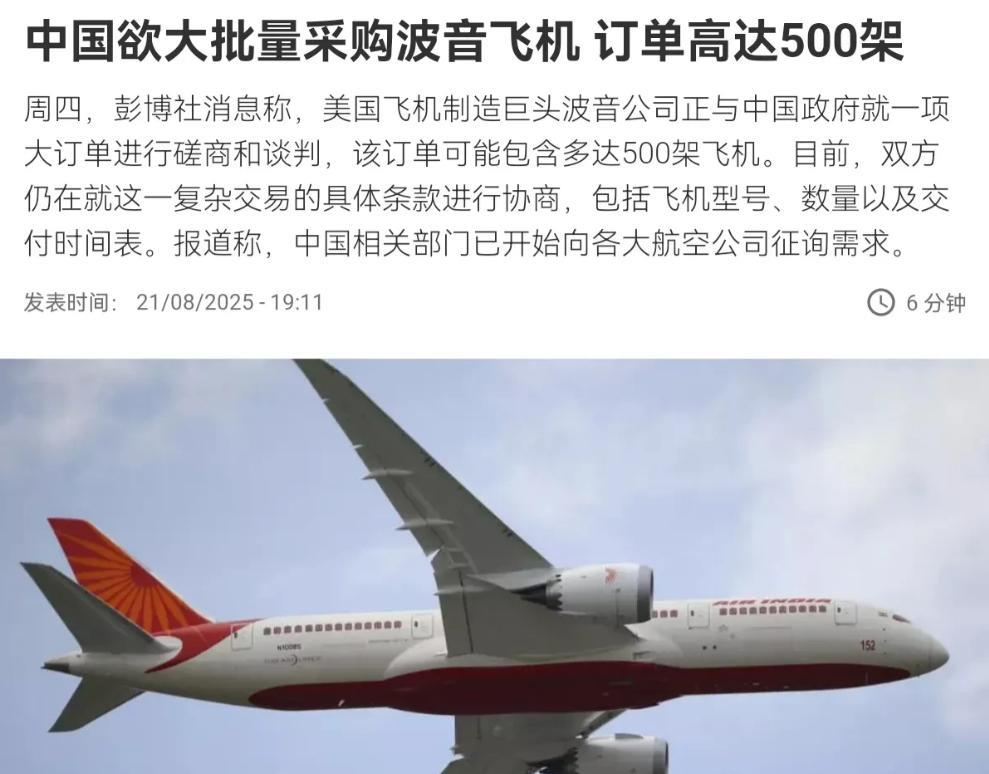 [熊猫]中国将订购500架美国波音飞机?中美协议将会达成?8月21日,美国彭博社突然刊出消息称,美国飞机制造巨头波音公司正与中国政府就一项大订单进行磋商和谈判,该订单可能包含多达500架飞机。 2017年特朗普访华那会儿,波音就和中国签过一笔价值370亿美元的大单,包含300架飞机,可惜2019年后,贸易摩擦、737 MAX停飞危机再加上疫情,波音在中国的订单几乎停摆。 据说从那时候起,波音只给中国交了30架飞机,远远落后于欧洲的空客,空客在中国市场可是风生水起,交付量甩了波音好几条街。 现在波音想靠这500架飞机的潜在订单,重新在中国这个全球第二大航空市场站稳脚跟。 中国航空市场的重要性谁都知道,波音自己预测,未来20年中国航空公司的飞机数量得翻倍,达到近万架。 国产的商飞虽然在努力,但短时间内产量和技术还跟不上这么大的需求,随着中国经济复苏,航空出行越来越火,航空公司对新飞机的需求特别迫切。 波音的737 MAX系列,省油又高效,估计会是这笔订单的主角,现在相关部门已经开始问国内航空公司需要啥飞机,看得出对这事挺上心。 这笔订单可不只是买飞机那么简单,它还跟中美贸易谈判挂钩,这几年,中美贸易关系有点紧绷,特别是2025年初特朗普上台后,美国对华商品加了高额关税,中国也暂停了波音的飞机交付作为回应。 航空订单在这种时候,往往就成了外交场合的“大招”,今年早些时候,波音在特朗普的中东行中拿下了卡塔尔航空160架宽体机和沙特20架737 MAX的订单,证明了航空交易在国际关系里的分量。 这次和中国的谈判,正赶上两国想缓和贸易矛盾的关键节点,有消息说这笔交易可能在10月底亚太经合组织峰会前有初步结果。 对中国来说,这不仅能锁定宝贵的飞机交付时间(波音和空客的生产线到2030年代都快排满了),还能在全球航空市场占个好位置。 对美国而言,这笔订单能缓解贸易逆差,还能给波音输点血,帮它从737 MAX事故和供应链问题的泥潭里爬出来。 对波音来说,这单生意则是个翻身的好机会,过去几年,波音真是倒了八辈子霉:737 MAX停飞、疫情冲击、工人罢工、供应链危机,股价一度跌了三分之一多。 不过,新上任的掌门人凯利·奥特伯格带着公司慢慢缓过来了,2025年,波音股价涨了27%,市场对它的信心在回暖。 如果能拿下这500架飞机的订单,波音不仅能喘口气,还能在和空客的较量中扳回一局。 不过,事情没那么简单,能不能谈成,还得看中美贸易关系能不能缓和。 另外,波音在中国的团队最近有点动荡,高管刘清离职,可能会让谈判多点波折。 更别提空客也在和中国谈一笔差不多的500架飞机订单,还没官宣,波音得在价格、交货时间和售后服务上多下功夫。 波音的掌门人年初说过,想在明年和中国多签点订单,现在这希望好像离现实近了点,但能不能成还得看接下来的谈判。