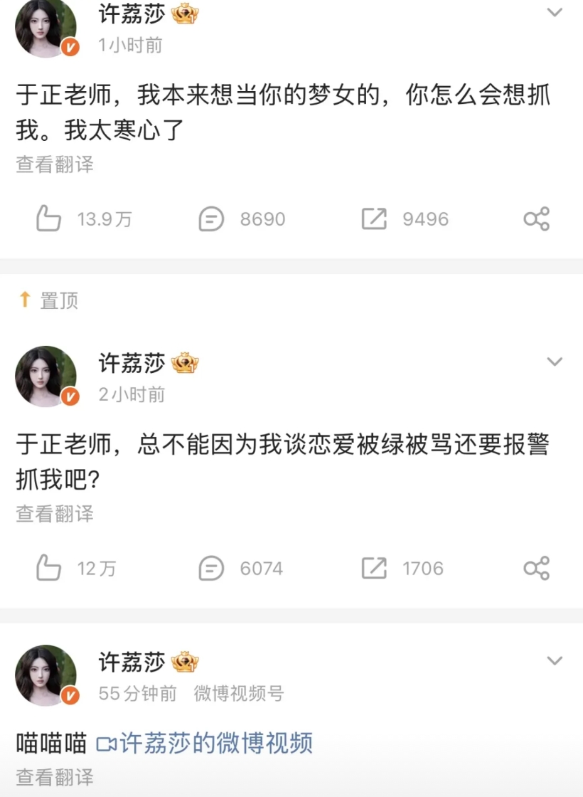 看来许凯22年的女友许荔莎挺聪明,知道体面对付不了于正,只能另辟蹊径,搞抽象,阴阳怪气,想必于正现在气急败坏得不成样子了