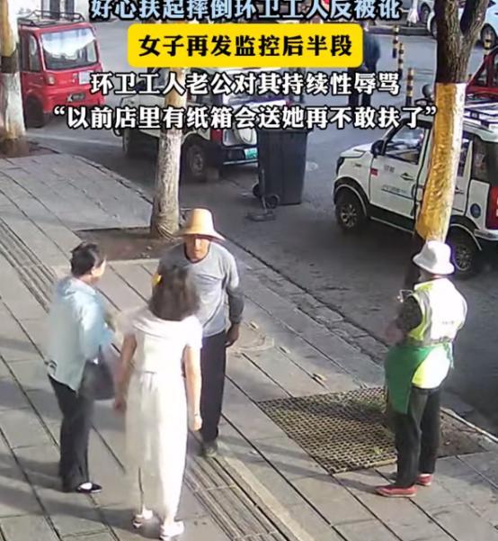 “王法官那句话的含金量还在上升!”云南昆明,一女子看到门外环卫女工摔倒,赶忙上前搀扶,不料,女工转头就说是女子的责任,还报警要求赔偿,女子上前理论,女工老伴更是言辞激烈。 事情发生在8月18日上午,郭女士(化名)正在店里工作,看到门外街上一名环卫女工倒在了地上,外面天气炎热,郭女士担心老太出现危险,就赶忙走到跟前搀扶。 郭女士平日里就经常做好事,店里有不用的纸箱子,她也经常免费送给来附近打扫的环卫工人,也从来不图回报。 在她看来,环卫工人是城市环境的守护者,他们也不容易。 只是,这次,郭女士却遇到了麻烦。 那名工人起身之后非但没有道谢,还拉着郭女士衣服不放,嚷嚷着说就是她泼的水才导致的摔倒,要求郭女士赔给她医疗费。 郭女士很是无语,明明是主动帮忙,没想到遇到讹钱的了,不过,看这老人满脸汗水,郭女士还是没有多说什么。 然而,女工却变本加厉,直接就报了警,还说如果不给钱这事没完。 郭女士再也无法控制内心的愤怒,主动过去理论,没想到女工的老伴也走了过来,非但没有及时劝架,反而助纣为虐,直接大骂郭女士,还嚷嚷着说就是郭女士把女工给推倒的。 要不是有路人拦着,那老头甚至还打算直接动手,郭女士更加郁闷。 很快,警方赶了过来,好在店门口安装了监控,警方调取监控视频发现就是女工自己不小心摔倒的,至于她说的地上的水也是最近下雨地面造成的积水,与郭女士没有任何关系。 警方当即向女工夫妇解释了事情经过,见有证据在,老两口也不再多说什么,郭女士也没打算继续追究女工夫妇的责任,这件事就告一段落。 只是,视频传到网上之后,广大网友还是为郭女士打抱不平,“不是你撞得你为什么要扶”,当年王法官的责问仿佛又被大家想起,扶不扶再次成了讨论的话题。 不少人觉得如果没有监控在,郭女士恐怕少不了赔钱,经过这件事之后,有网友表示,以后遇到类似情况还是要第一时间先看附近有没有监控,然后用手机录好视频,然后再考虑是否扶老人。 只能说,有些人占小便宜惯了,确实不值得搀扶。 对此,大家又是怎么看的呢?