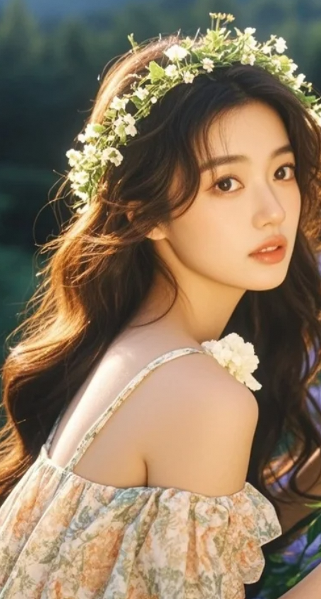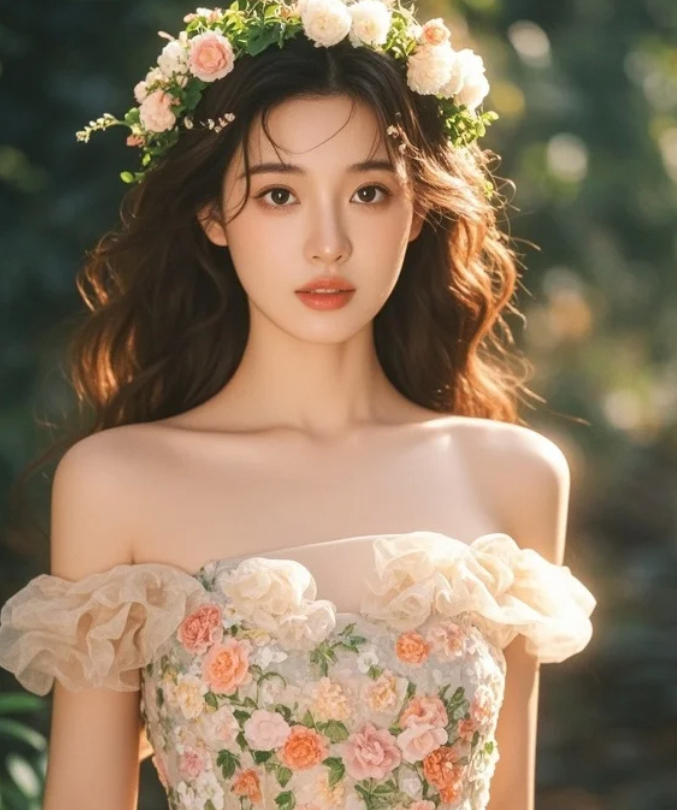 山林中的精灵:身穿露肩花朵裙,头戴花环,她是自然的女儿