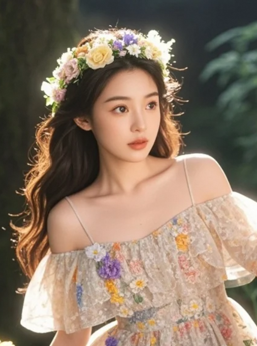 山林中的精灵:身穿露肩花朵裙,头戴花环,她是自然的女儿