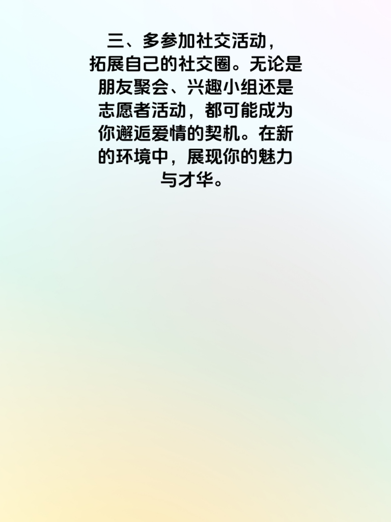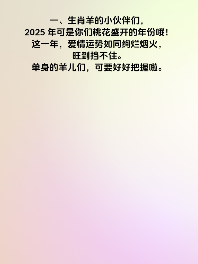 一、生肖羊的小伙伴们,2025 年可是你们桃花盛开的年份哦!这一年,爱情运势如同绚烂烟火,旺到挡不住。单身的羊儿们,可要好好把握啦。 二、首先,要保持积极乐观的心态。微笑是最具感染力的,它能吸引身边的人主动靠近你。以热情开朗的姿态去面对生活,会让你在人群中格外亮眼。 三、多参加社交活动,拓展自己的社交圈。无论是朋友聚会、兴趣小组还是志愿者活动,都可能成为你邂逅爱情的契机。在新的环境中,展现你的魅力与才华。 四、注重自身形象管理。不需要过度奢华,但要整洁得体。合适的妆容、得体的穿搭,会让你更加自信,也更容易给人留下好印象。 五、当遇到心仪的对象时,不要羞涩。勇敢地迈出第一步,主动交流。真诚地表达自己的想法和感受,说不定就能开启一段美好的恋情呢。抓住 2025 年的好时机,让爱情之花在你身边绽放吧。