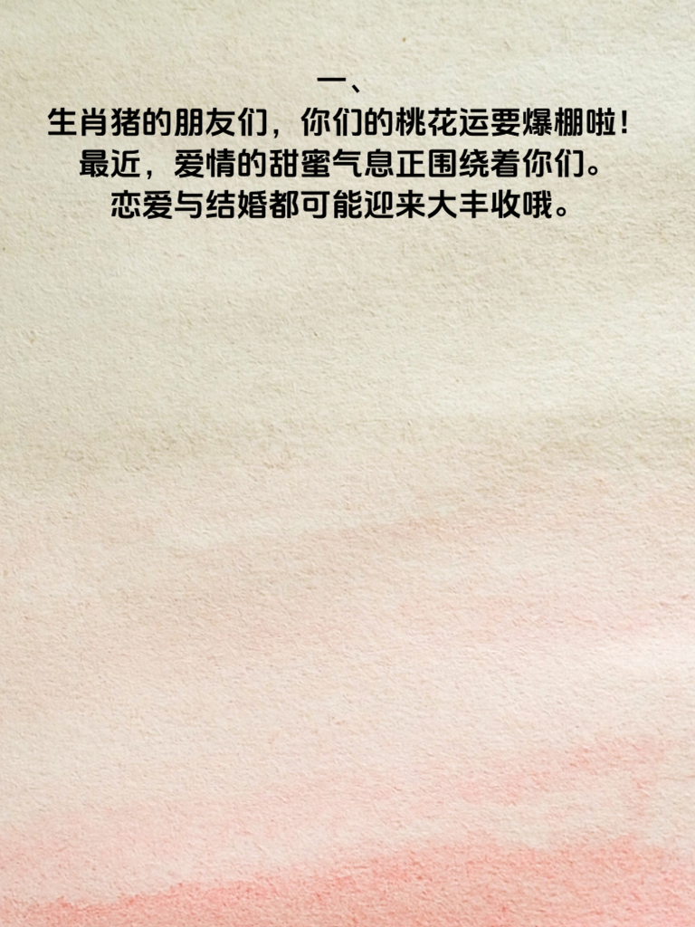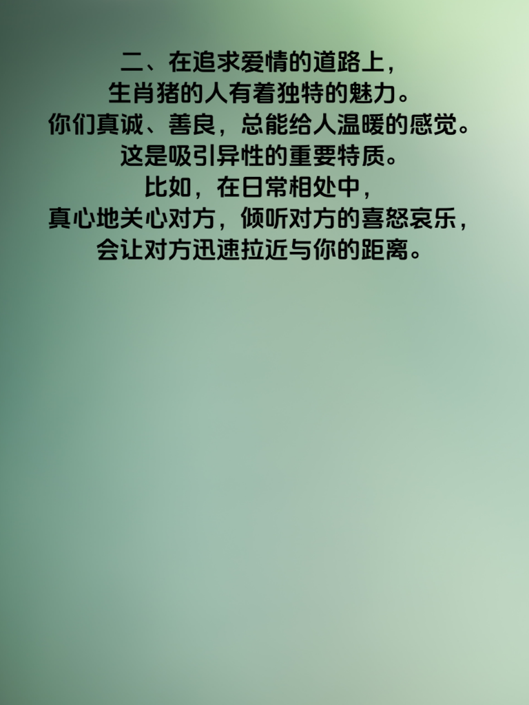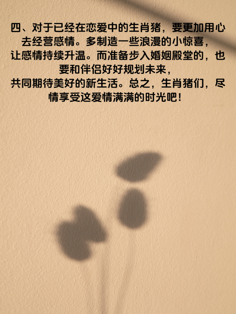 一、生肖猪的朋友们,你们的桃花运要爆棚啦!最近,爱情的甜蜜气息正围绕着你们。恋爱与结婚都可能迎来大丰收哦。 二、在追求爱情的道路上,生肖猪的人有着独特的魅力。你们真诚、善良,总能给人温暖的感觉。这是吸引异性的重要特质。比如,在日常相处中,真心地关心对方,倾听对方的喜怒哀乐,会让对方迅速拉近与你的距离。 三、想要恋爱顺利,不妨多参加一些社交活动。扩大自己的社交圈,增加遇见有缘人的机会。说不定在某个不经意的瞬间,那个特别的人就出现了。 四、对于已经在恋爱中的生肖猪,要更加用心去经营感情。多制造一些浪漫的小惊喜,让感情持续升温。而准备步入婚姻殿堂的,也要和伴侣好好规划未来,共同期待美好的新生活。总之,生肖猪们,尽情享受这爱情满满的时光吧!