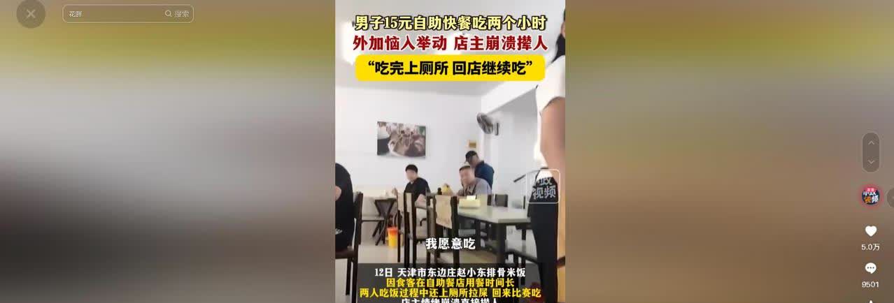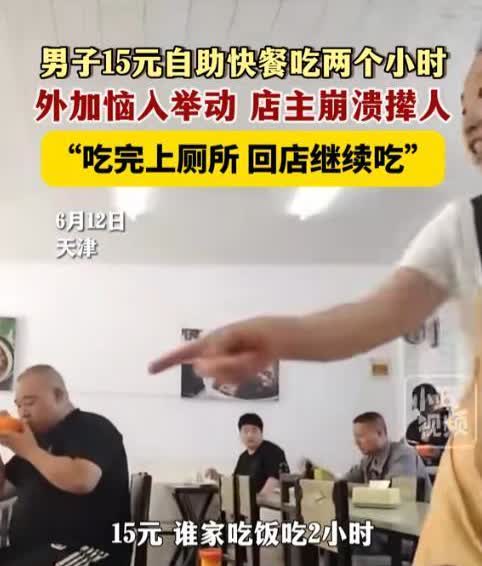 到底是顾客脸皮厚,还是老板太无理?天津,一男子花15 元吃自助餐,吃 2 个小时,吃饱了就玩手机或者去上厕所解决一下,回来后继续吃。老板娘嫌男子吃的时间长,直接开口赶男子走,可男子不走,还说老板娘玩不起,老板娘直接爆粗口... 在天津,有家自助快餐店,只要15块钱就能随便吃,吸引了不少人,特别是周边的农民工朋友。可有一天,有个大哥在店里从中午11点开始吃,一直到下午都没走。 这位大哥一进来就交了15块钱,开始自助。老板娘胡女士一开始也没太在意,但一个小时都过去了,他还在那儿边吃饭边玩手机,也不说走。又过了整整一个小时,他起身去了趟厕所,回来竟然又拿了一盘吃的继续。从11点到1点,他从吃饭变成了“霸占”座位,店里的客人都换了好几波了,他还是稳如泰山地坐着。 胡女士实在看不下去了,就走过去问他吃好没,其实就是想让他走。结果这位大哥理直气壮地说:“这是自助餐,又没限制时间,我还能吃,凭啥赶我走?”胡女士一听就火了:“你吃俩小时,哪家自助餐能受得了?”大哥还是不挪窝,胡女士一激动,就说了几句脏话。大哥也不甘示弱,拿出手机录了视频传到网上,说老板娘“玩不起”。这事儿被大家知道后,评论区里大家并没有像那个男的想的那样去骂老板娘,反倒是很多人说那个男的爱占小便宜。最后,那个男的自己走了,店家也明白了,以后得把用餐时间说清楚,省得再有这种麻烦。