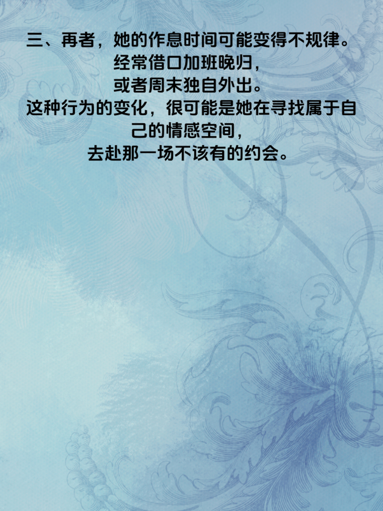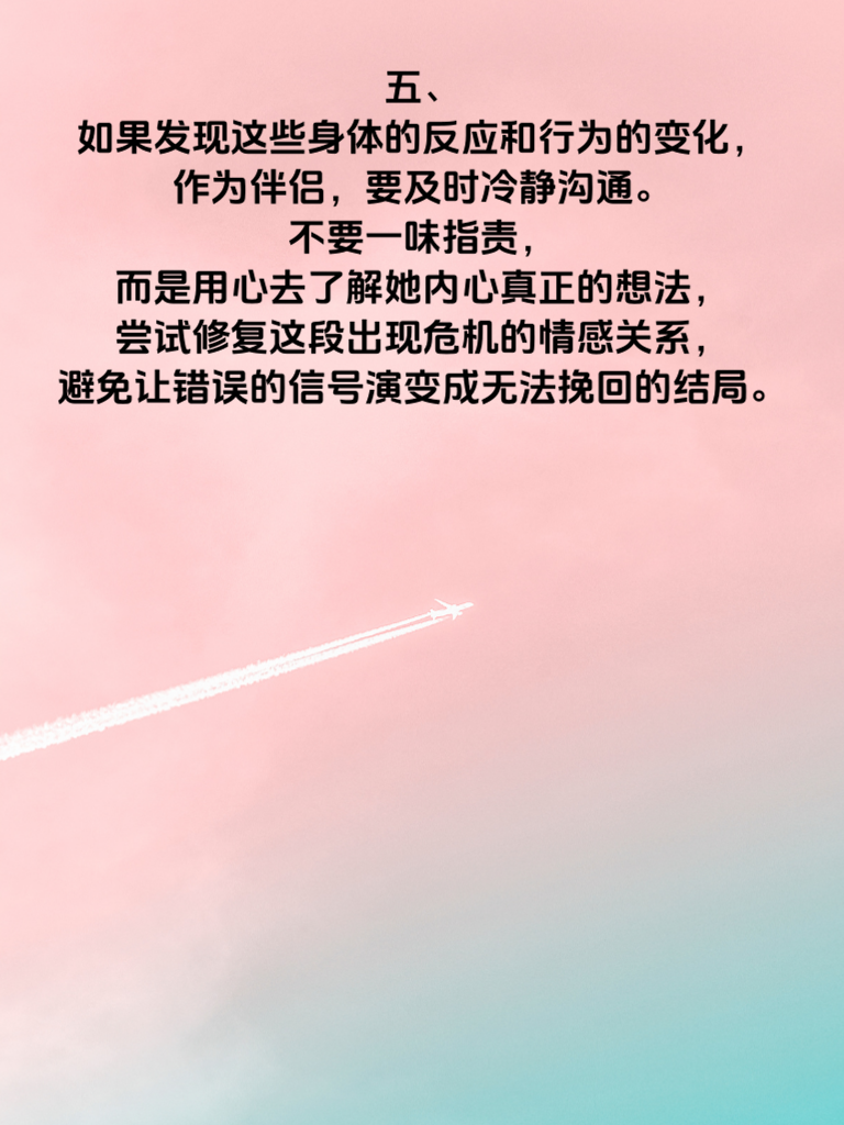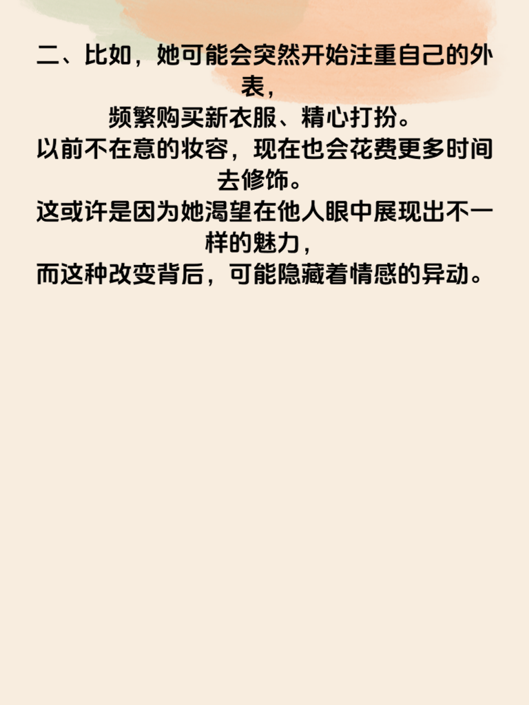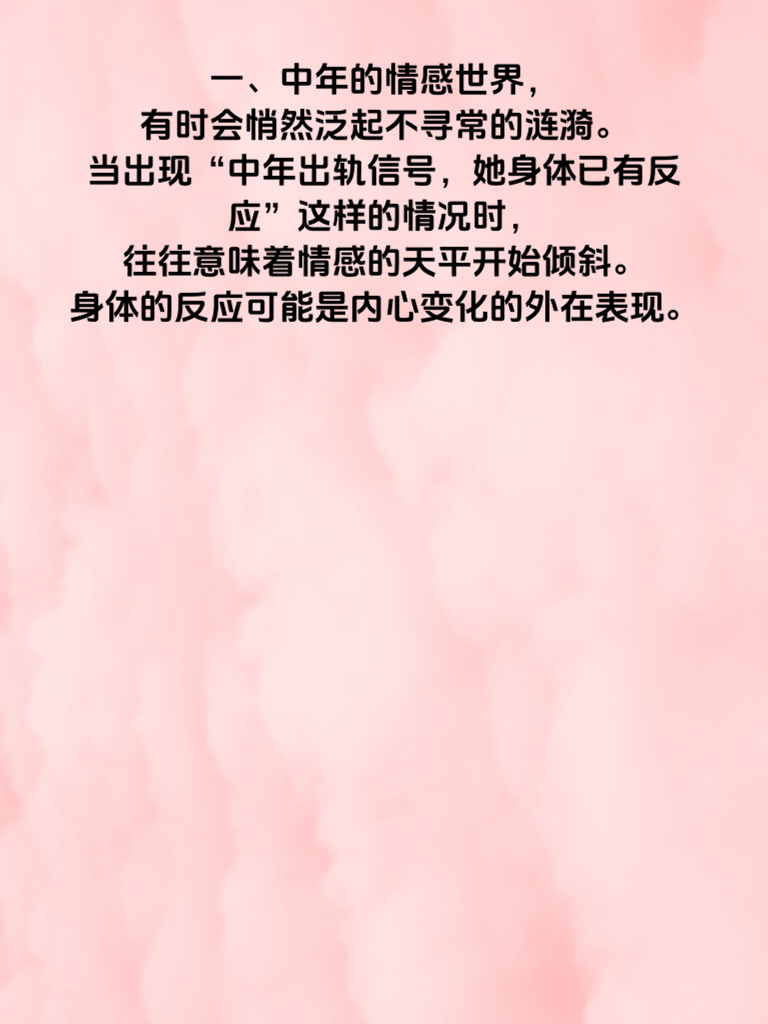 一、中年的情感世界,有时会悄然泛起不寻常的涟漪。当出现“中年出轨信号,她身体已有反应”这样的情况时,往往意味着情感的天平开始倾斜。身体的反应可能是内心变化的外在表现。 二、比如,她可能会突然开始注重自己的外表,频繁购买新衣服、精心打扮。以前不在意的妆容,现在也会花费更多时间去修饰。这或许是因为她渴望在他人眼中展现出不一样的魅力,而这种改变背后,可能隐藏着情感的异动。 三、再者,她的作息时间可能变得不规律。经常借口加班晚归,或者周末独自外出。这种行为的变化,很可能是她在寻找属于自己的情感空间,去赴那一场不该有的约会。 四、另外,她对伴侣的态度也会有所转变。不再像以往那样温柔体贴,可能会变得挑剔、不耐烦。这是她内心对现有情感关系不满的一种体现,而这种不满,正是出轨信号滋生的土壤。 五、如果发现这些身体的反应和行为的变化,作为伴侣,要及时冷静沟通。不要一味指责,而是用心去了解她内心真正的想法,尝试修复这段出现危机的情感关系,避免让错误的信号演变成无法挽回的结局。