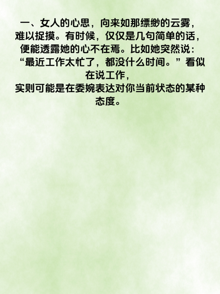 一、女人的心思,向来如那缥缈的云雾,难以捉摸。有时候,仅仅是几句简单的话,便能透露她的心不在焉。比如她突然说:“最近工作太忙了,都没什么时间。”看似在说工作,实则可能是在委婉表达对你当前状态的某种态度。 二、当她回应你时总是简短而敷衍,像“嗯”“哦”这样的字眼频繁出现,这很可能意味着她心思没在你们的交流上。也许她正被其他事情困扰,或者对你此刻的话题兴趣缺缺。 三、又或者她会岔开话题,明明你在认真分享一件事,她却突然说起别的毫不相干的事儿。这往往暗示她的心已经飘到了别处,没有全情投入到和你的对话中。 四、男人要明白,遇到这种情况,别一味地追问,给她一些空间,让她能处理好自己的思绪。同时,反思自己是否哪里做得不够好,适时调整相处方式,重新吸引她的注意力,让她的心再次回到你身边。 五、情感的互动是一场微妙的舞蹈,读懂这些心不在焉背后的信号,才能更好地与她共舞,让你们的感情在理解与包容中愈发深厚。