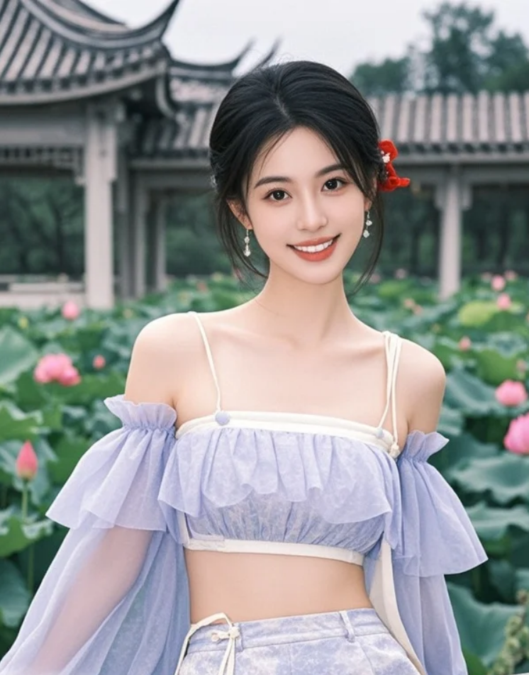 她立于荷塘,风过处,裙裾与荷叶同漾,心事随露珠滑落。