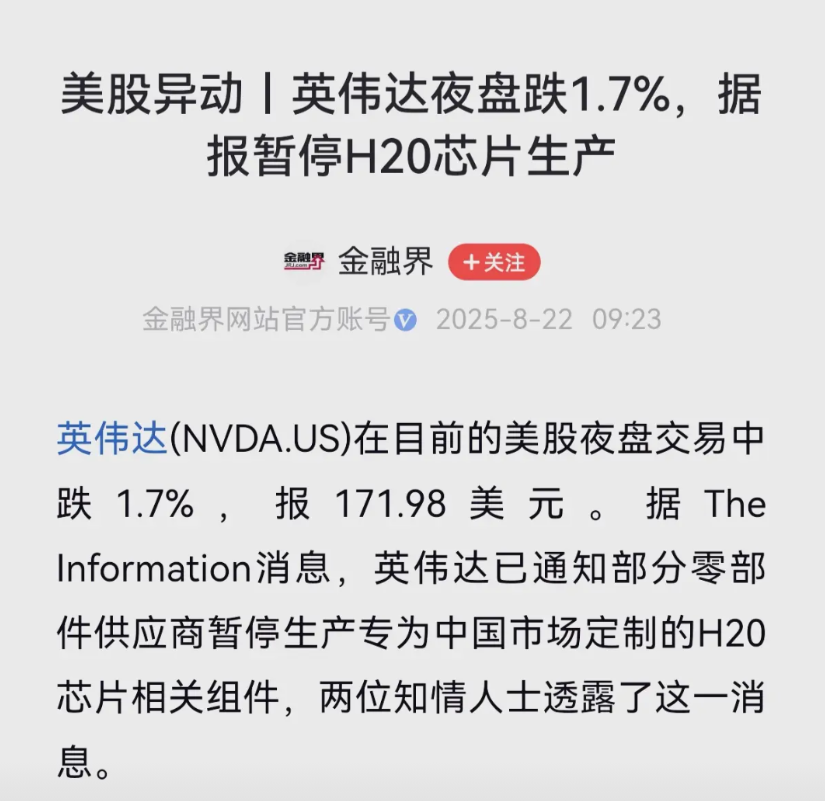 来自金融界的确切消息,英伟达特供中国市场的算力芯片H20停产了。不久前,工信部约谈了英伟达公司要求该公司对远程控制等安全性能问题作出详细解释,而该公司除了口头上否认有所谓的后门隐患,并没有积极回应工信部的要求,继而作出了停产决定。