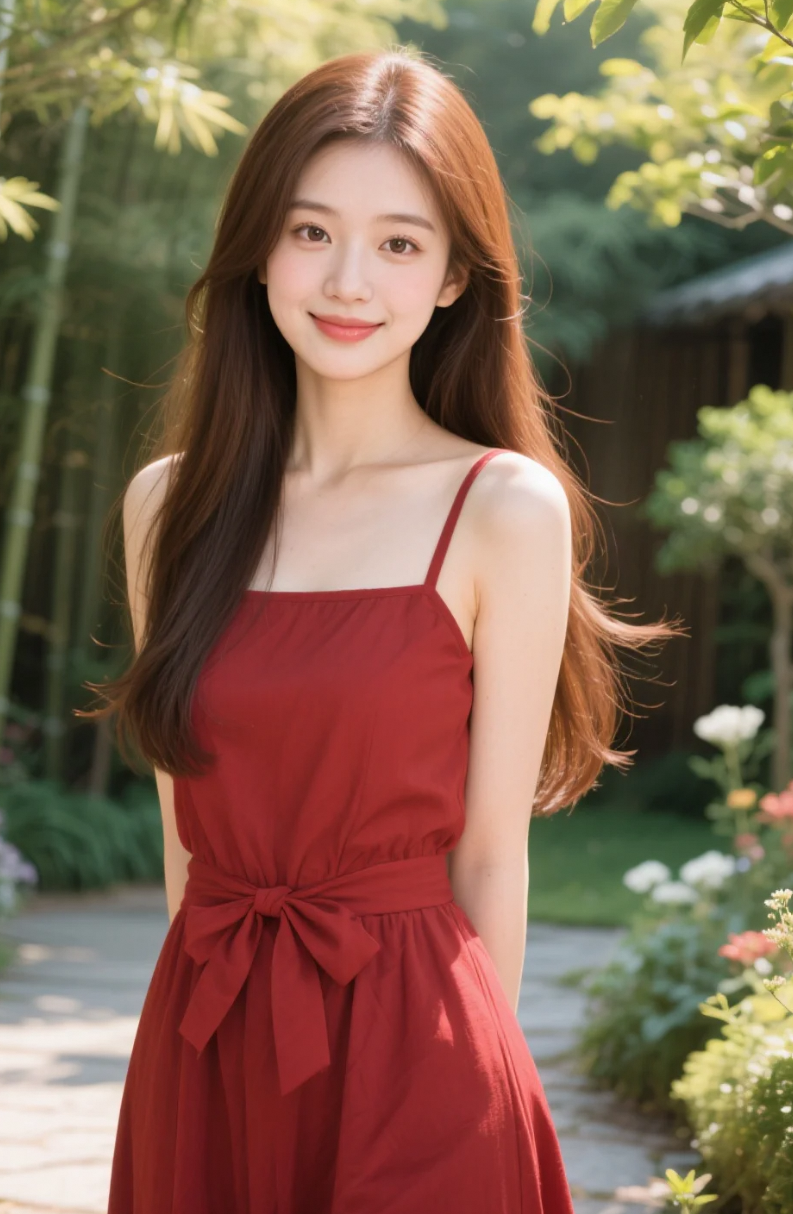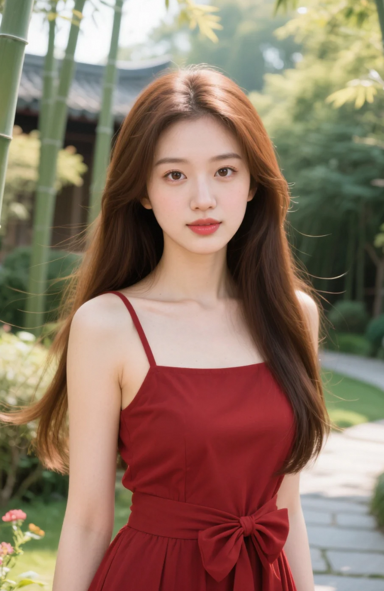 她站在竹影深处,酒红裙摆轻扬,连风都为她静止了一秒